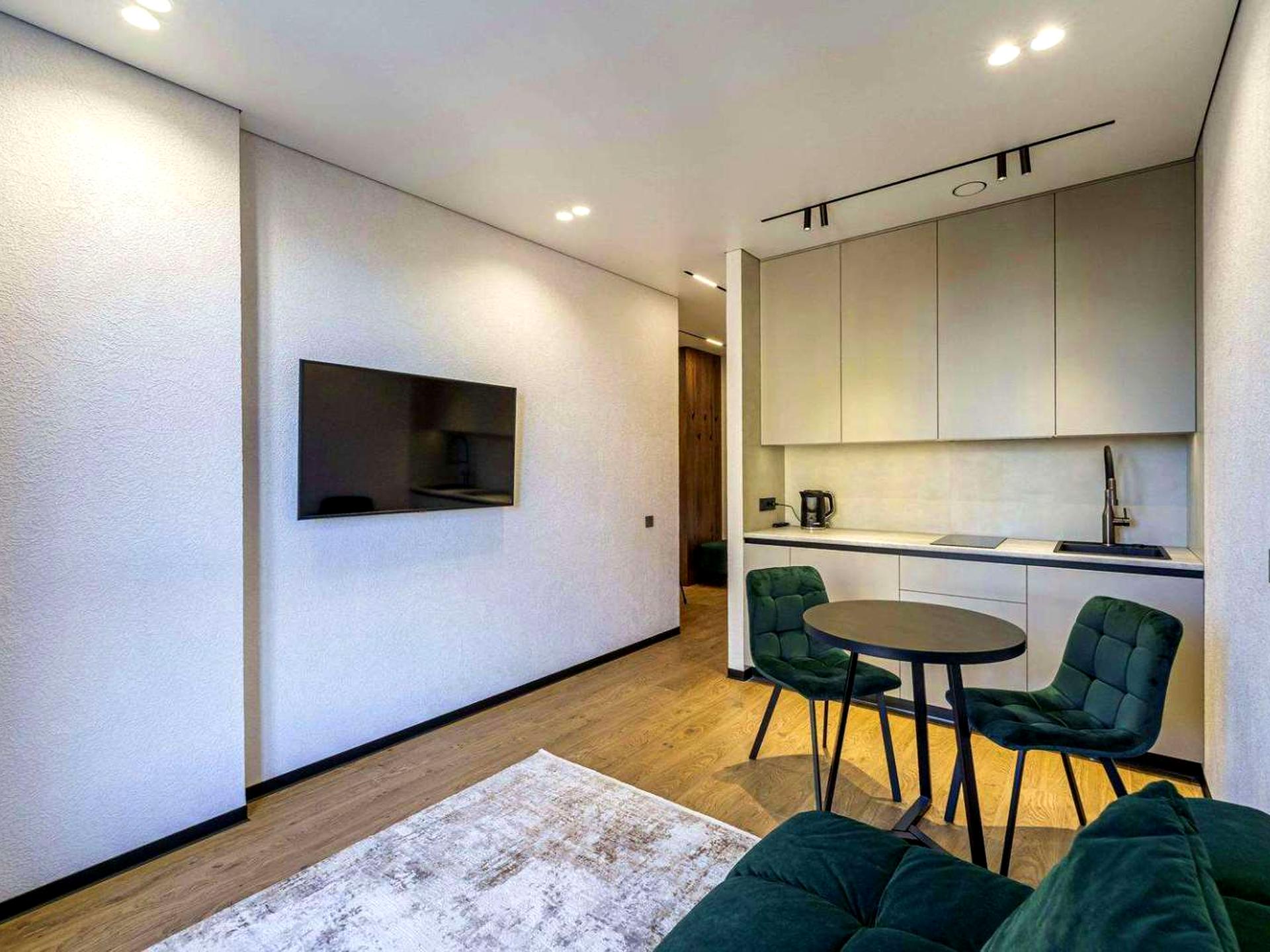 В квартире 1 комната, Технологія будівництва - Цегляна, Тип будинку - Спец. проект. Кухонная плита электрическая. Дом построен в 2023 году. Общее состояние квартиры - С ремонтом. Количество санузлов: 1. Тип кухни - кухня-студия. Количество спален: 1. Комиссия за услуги 5 %