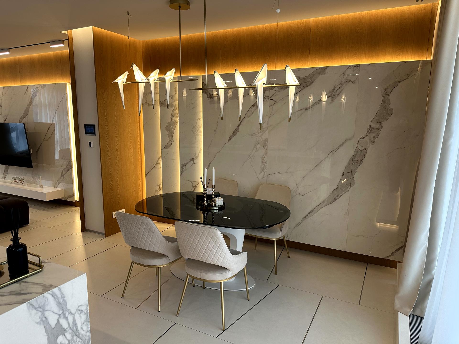 • Освітлення: дизайнерські люстри та прихована підсвітка створюють атмосферу затишку