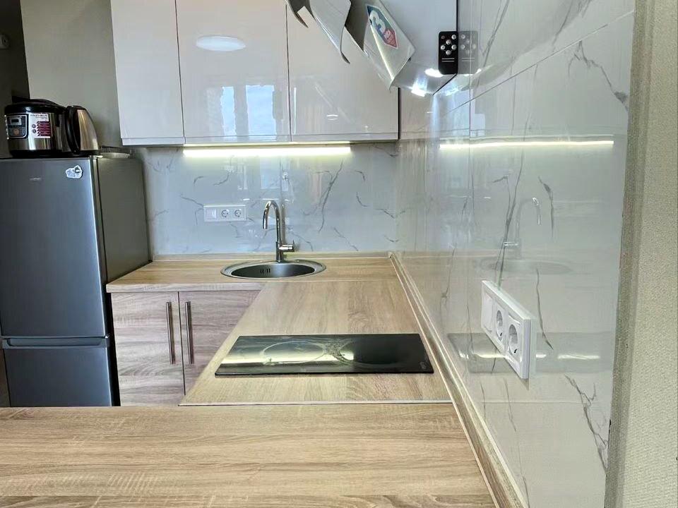 В квартире 1 комната, высота потолков 2.7 метра, Технологія будівництва - Монолітно-каркасна, Тип будинку - Спец. проект. Газа нет, кухонная плита электрическая. В квартире есть Кондиционер, Стиральная машина, Душевая кабина, Холодильник, Микроволновка. Дом построен в 2018 году. Общее состояние квартиры - С ремонтом. Горячая вода - электрический бойлер. Количество санузлов: 1. Интернет оптоволоконный. Работает без света - вода, отопление, лифт. Тип кухни - кухня-студия. Количество спален: 1. Комиссия за услуги 5 %