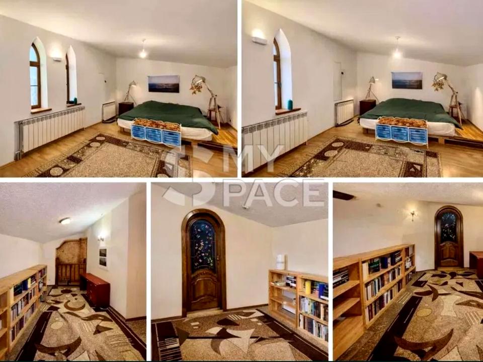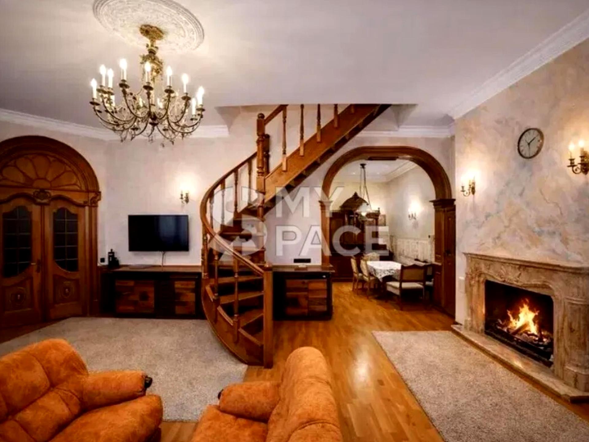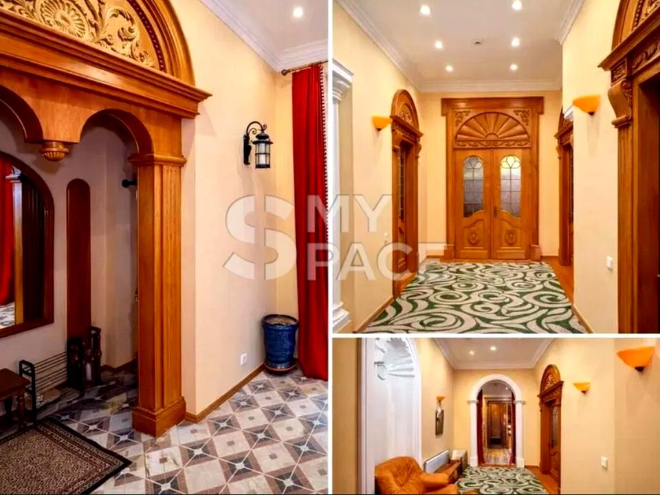 Дворівнева квартира площею 280 м², яка більше нагадує приватний будинок у центрі міста. 2 рівні з логічним зонуванням висота стелі до 4 метрів простора вітальня з діючим каміном з оніксу авторські дерев’яні сходи натуральні матеріали: масив дуба, мармур, венеціанська штукатурка Роботи по дереву робились майстром. 6 кімнат гардеробні балконів ПЛАНУВАННЯ 1 поверх: житлова зона для сім’ї — спальні, дитячі, кухня, сауна, джакузі .2 поверх: простір для відпочинку, усамітнення та гостьових зон.