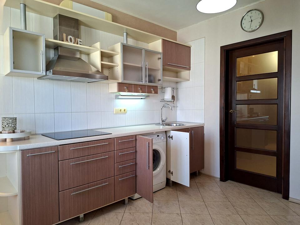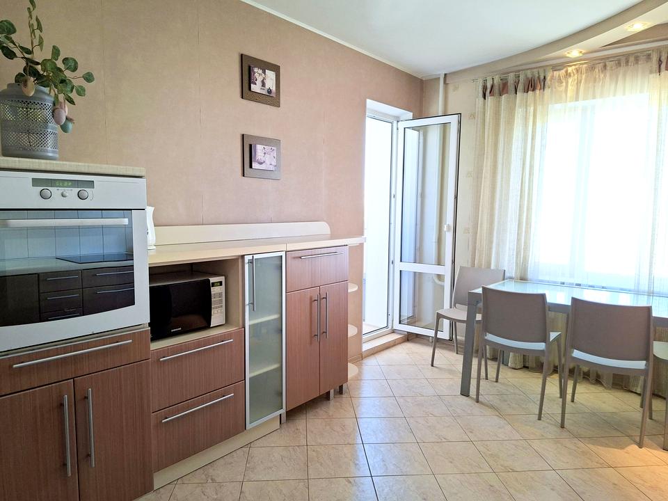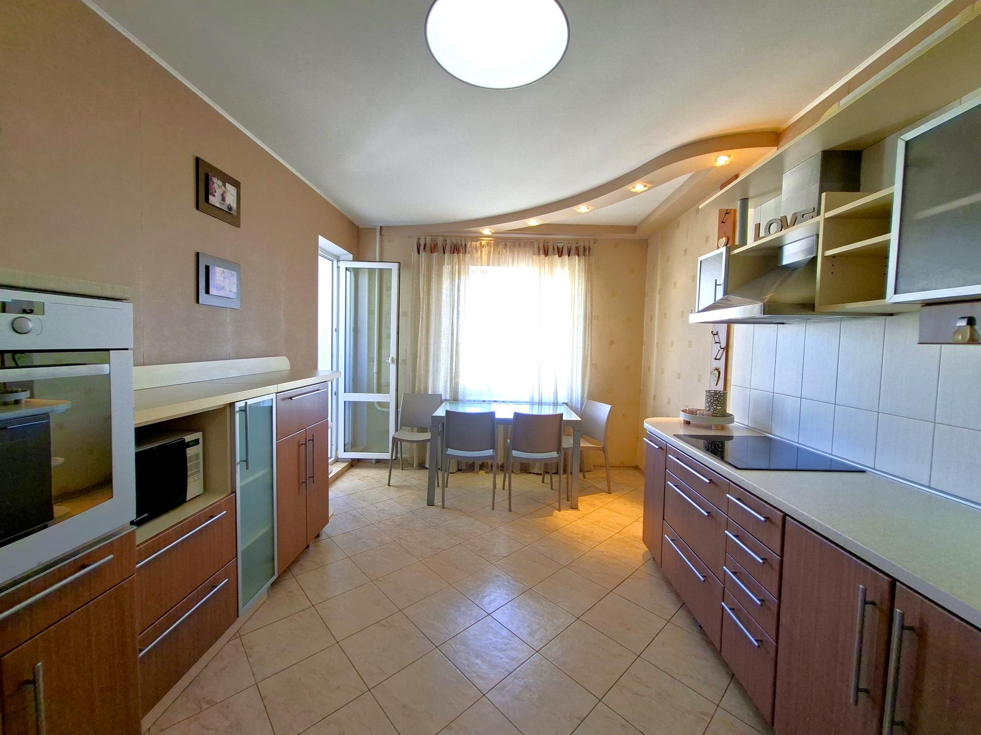 Кухня з балконом, вихід на нього також із вітальні — зранку можна пити каву з видом на місто, а ввечері — відпочивати у власному куточку тиші. Меблі й побутова техніка залишаються, тож при заселенні достатньо лише взяти особисті речі. Є гардеробна й просторий тамбур із місцем для зберігання — тут нічого не стоїть «під ногами».