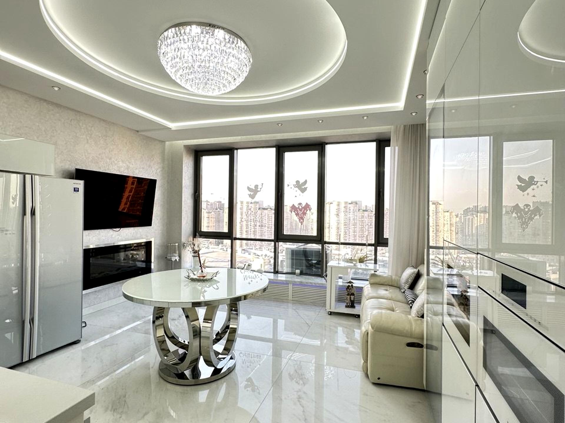 Багаторівневе освітлення дозволяє змінювати настрій простору протягом дня, а кришталеві італійські люстри стають витонченими акцентами.