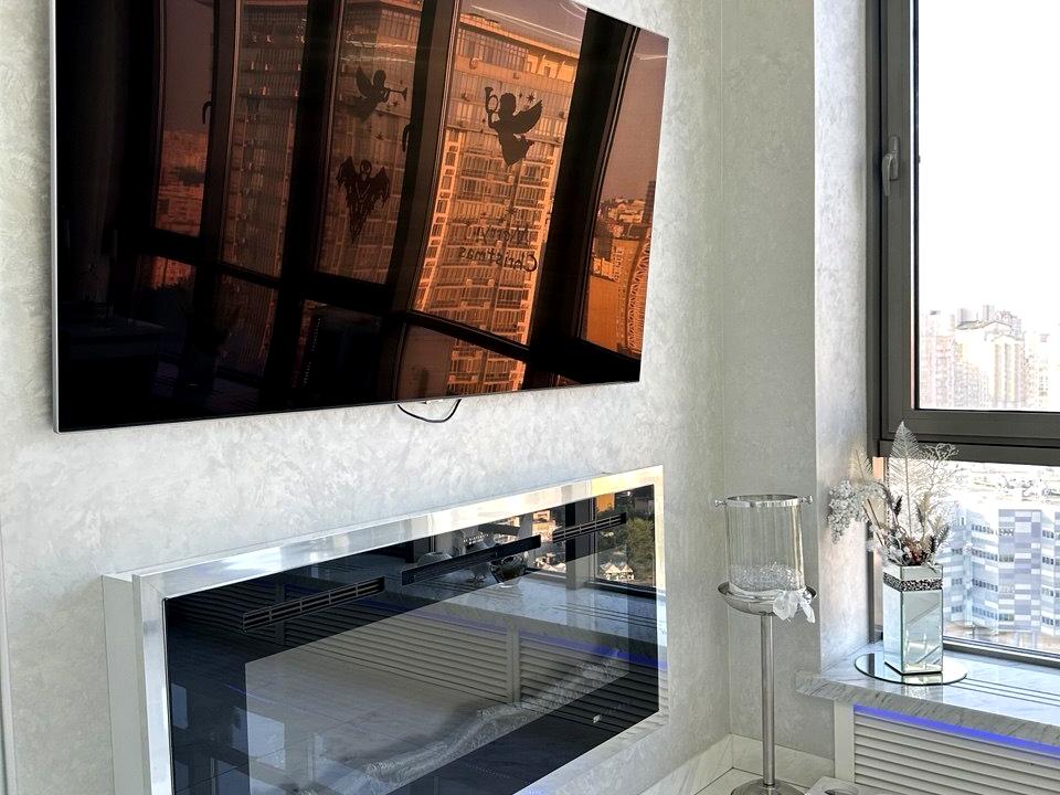 У кожній кімнаті встановлена техніка, включно з телевізорами. Італійські меблі та текстиль, виготовлені на замовлення, довершують образ гармонійного й респектабельного інтер’єру.