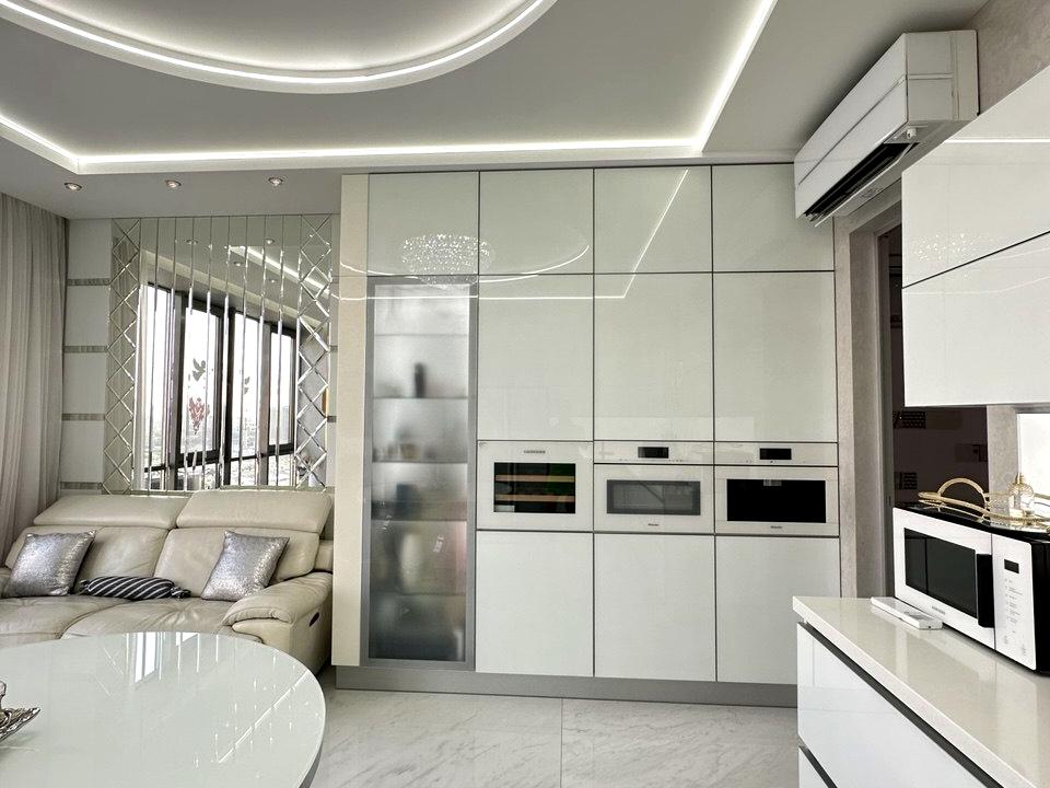 Простора світла квартира площею 120 м² розташована на 19 поверсі 23-поверхового будинку у престижному житловому комплексі з власною набережною та мальовничим видом на Дніпро.