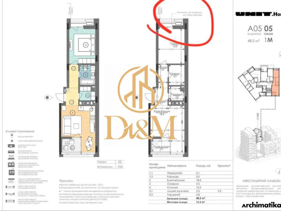 Квартира з продуманим плануванням у дві зони. Простір функціонально розділений: кухня-вітальня відокремлена санвузлом та гардеробною від спальні, що забезпечує комфорт і приватність.