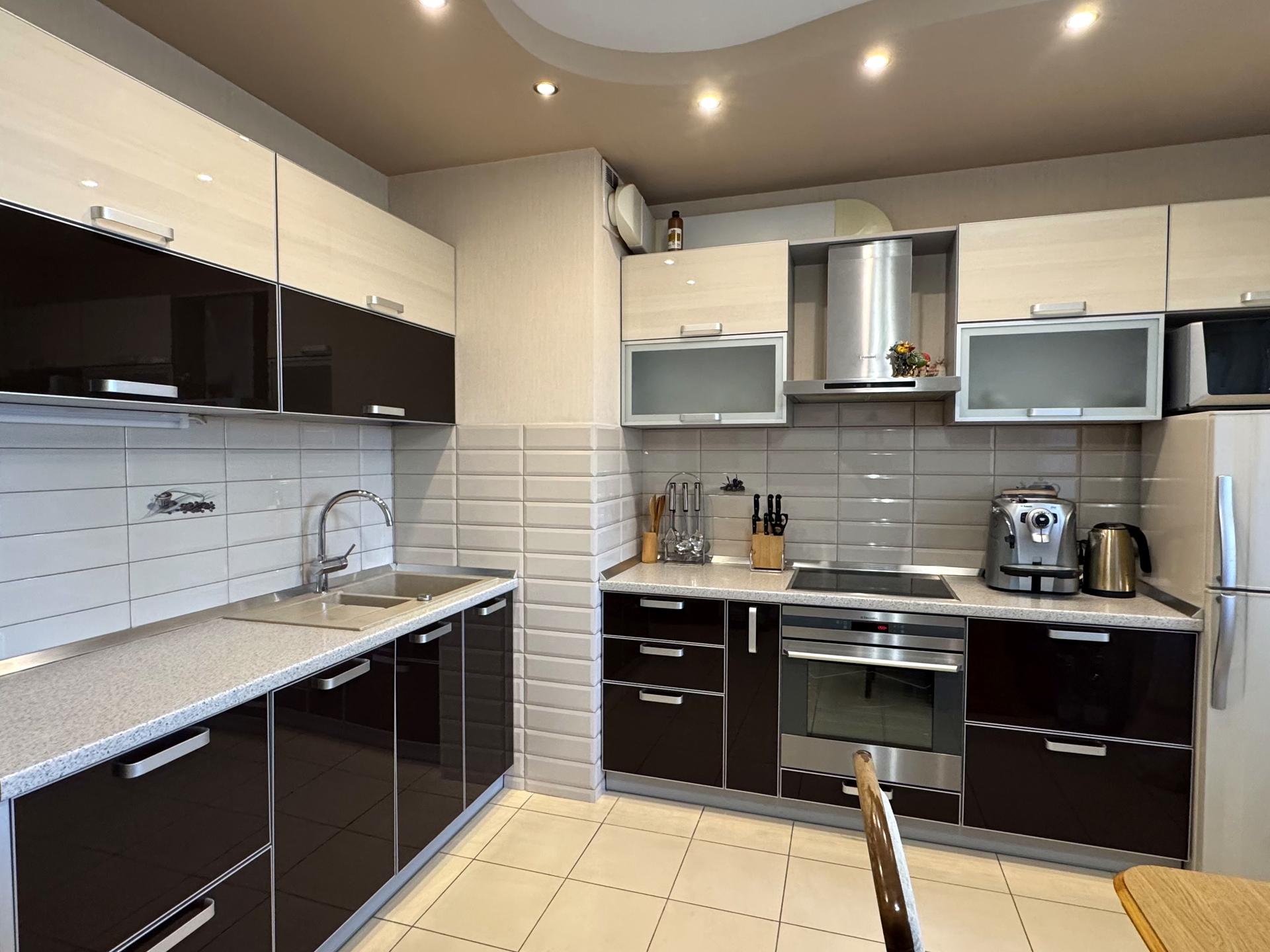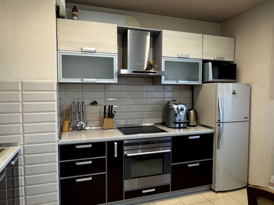 -Вбудована кухня, прсудомийна машина, 2кам.холодильник, мікрохвильова піч, плита, духовка, витяжка, кавомашина, ел.чайник, кух.стіл +стільці.