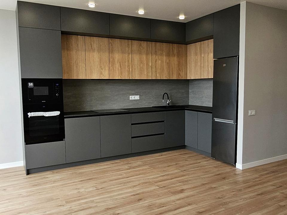 - Кухня -вітальна з якісними меблями під замовлення, функціональними шафами та вбудованою побутовою технікою