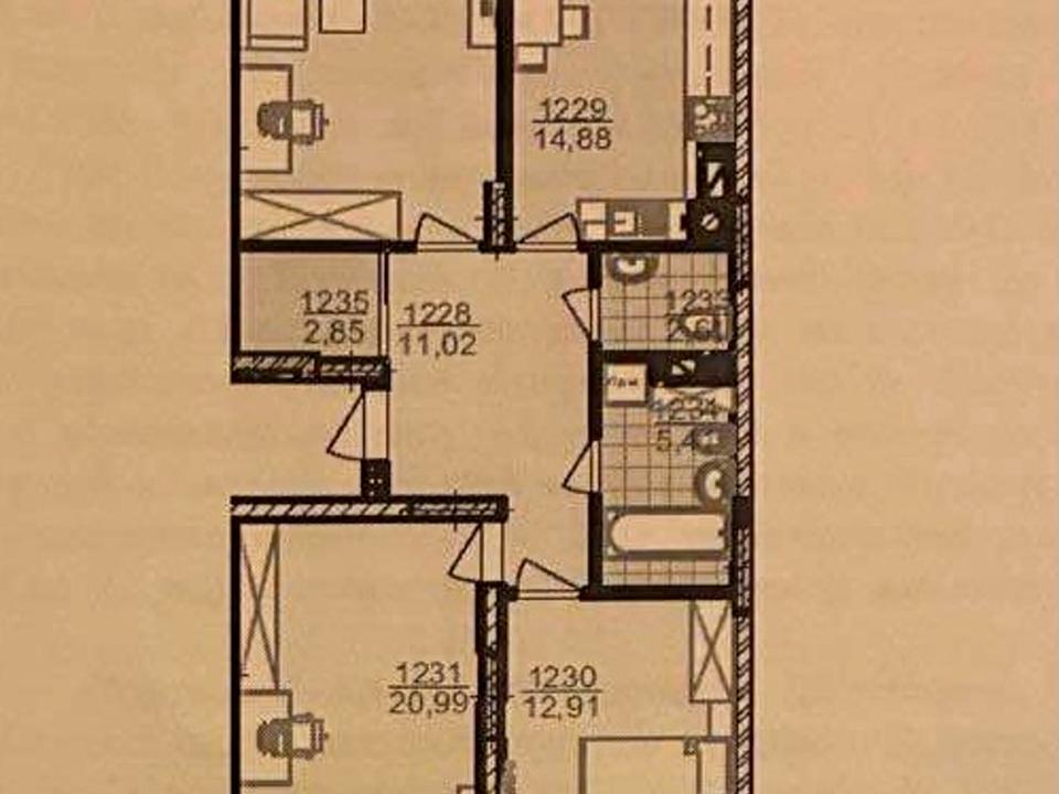 Планування - Кухня 14.88 кв, Житлова комната 1 - 18,21, Передпокій - 11,02, Санвузол - 5,41, Вбиральня - 2,61, Житлова комната 2 - 12,91, Житлова комната 3 - 20,99, Гардероб - 2,85