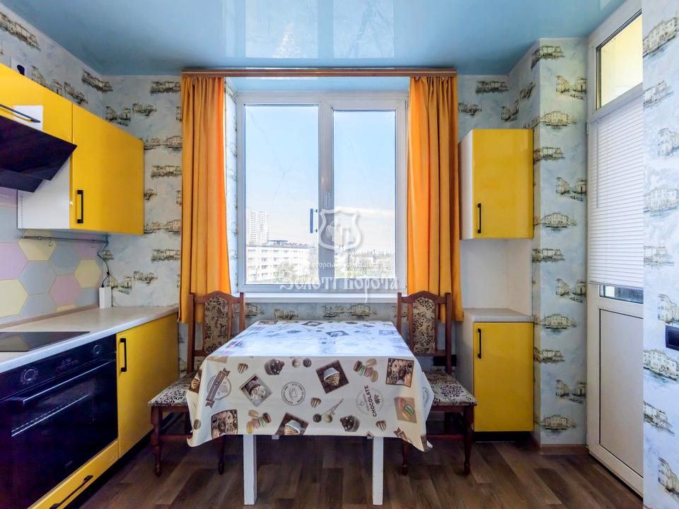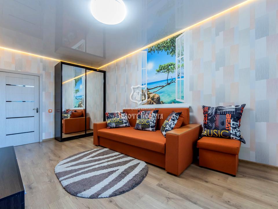 Функціональність інтер’єру підкреслюється великою кількістю місць для зберігання: у коридорі розміщено три місткі шафи, а в кімнаті — велика шафа-купе з дзеркальними дверима. Житлова зона облаштована зручним диваном для відпочинку, а наявність заскленої лоджії збільшує корисний простір квартири. Кухня та санвузол у бездоганному стані й повністю готові до користування.