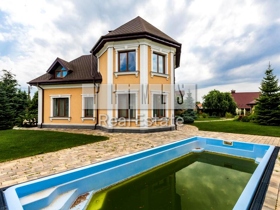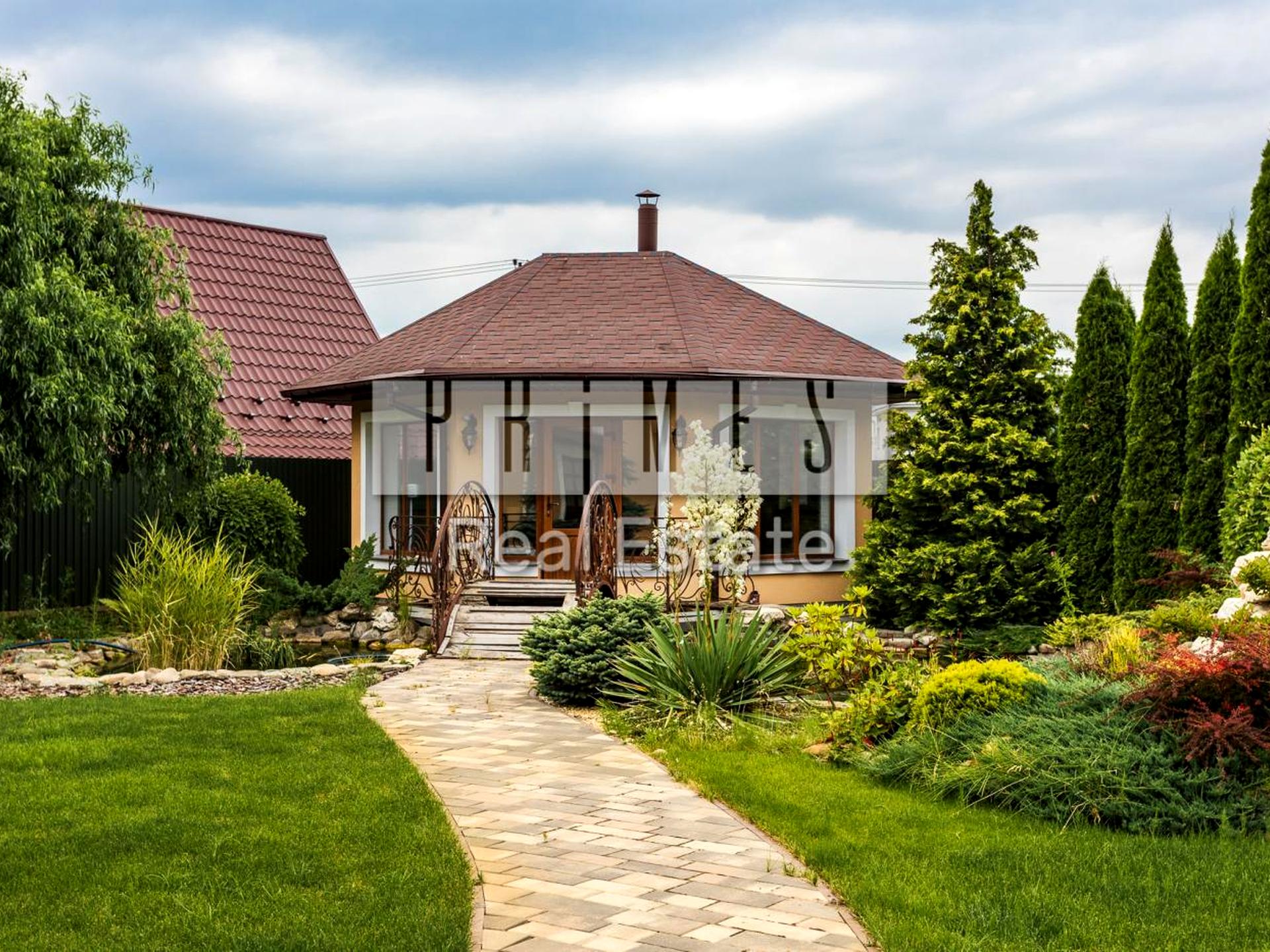 Пропонується на продаж двоповерховий цегляний будинок площею 295,2 м² із затишним гостьовим будиночком із сауною, приватним ставком, басейном і неймовірно мальовничим ландшафтом на ділянці 15 соток.