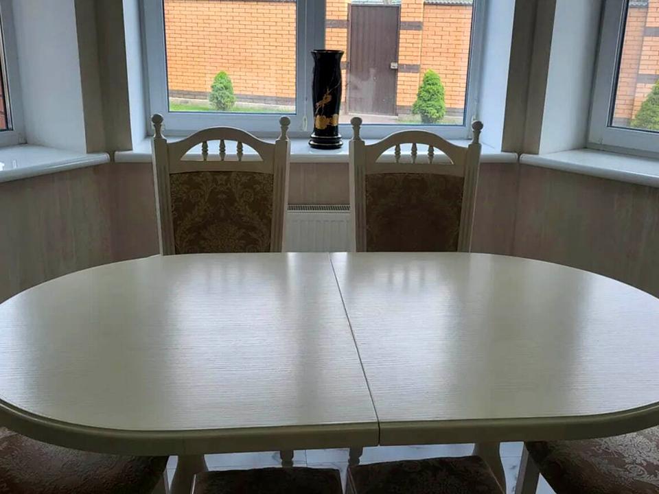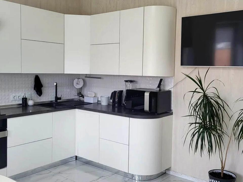 – Кухня з вмонтованою технікою: варильна панель, духовка, посудомийка, холодильник, мікрохвильова піч, блендер, чайник, стіл та стільці