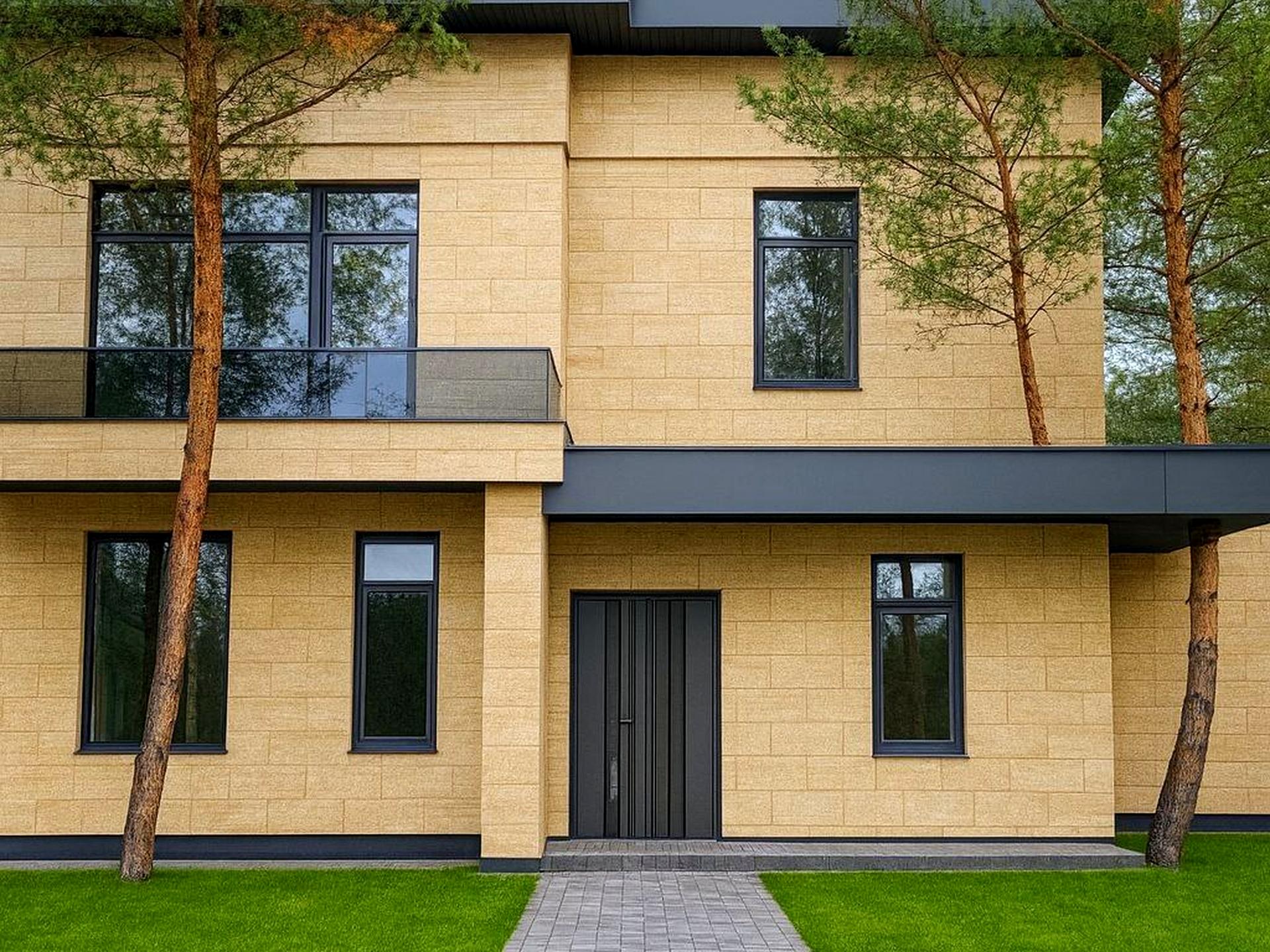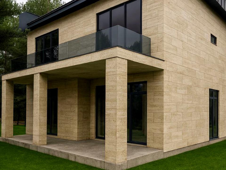 Будинок побудований із якісних матеріалів. Стіни з газоблоку 300 мм, утеплення пінопластом 100 мм. Перекриття — монолітна плита, фундамент монолітно-стрічковий з плитою. Фасад оздоблений натуральним каменем травертин, що надає будинку стильного та дорогого вигляду. Покрівля односкатна з металочерепиці, утеплена мінеральною ватою 200 мм. По всьому будинку встановлені якісні вікна REHAU.