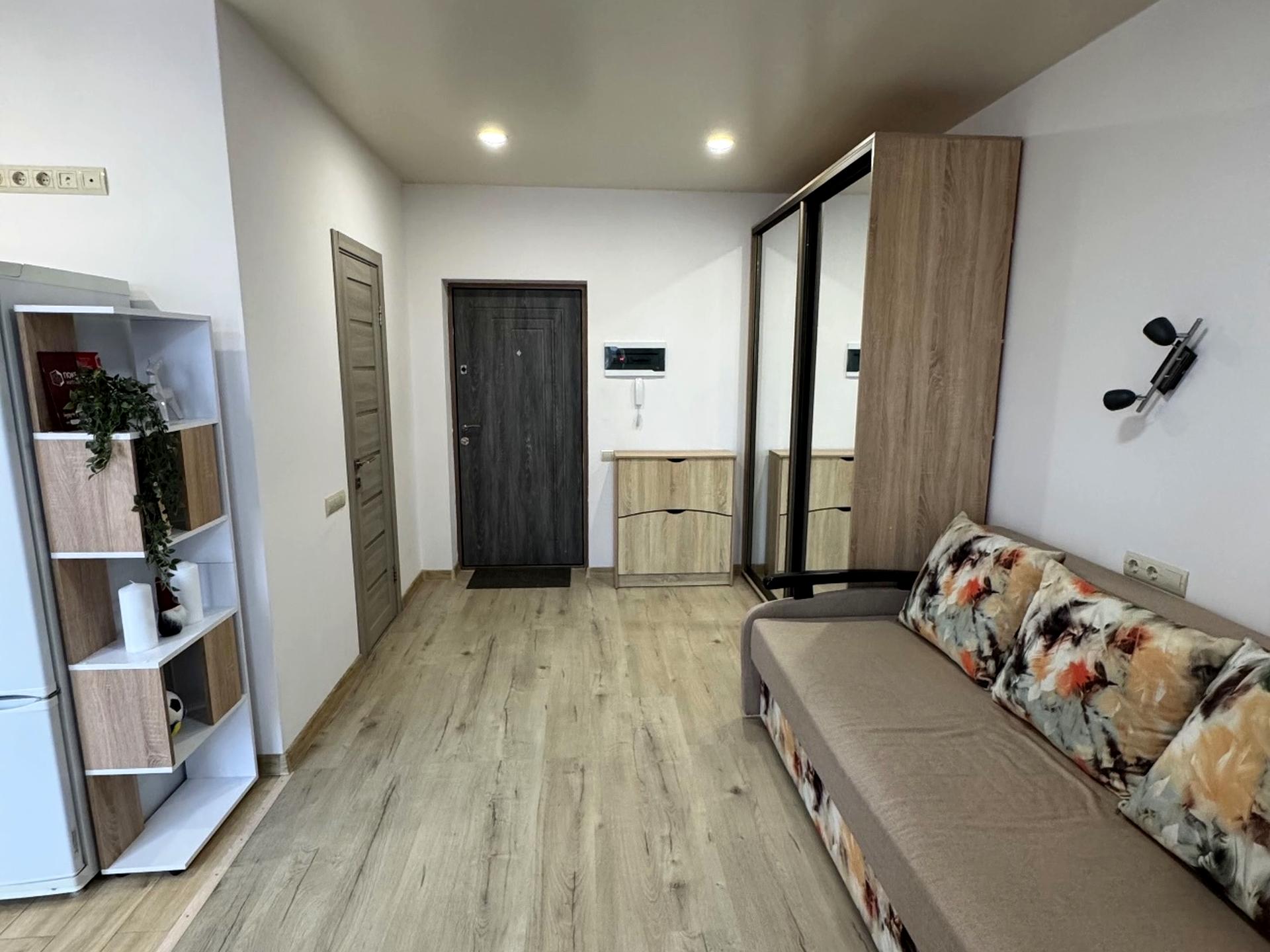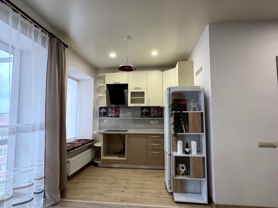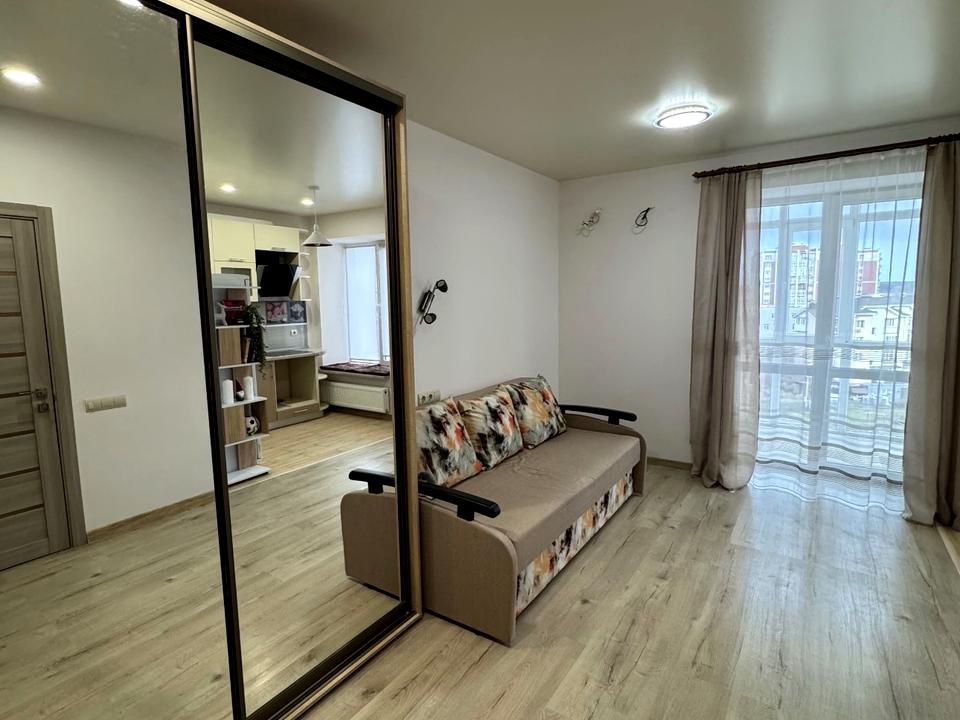 Комфортна квартира-студія з якісним ремонтом, розташована на 6 поверсі будинку з автономною котельнею — комфортне тепло взимку та стабільні комунальні витрати. Простір продуманий і затишний: світлі відтінки оздоблення, зручна зона відпочинку з розкладним диваном і великою шафою-купе з дзеркальними фасадами, яка додає простору та забезпечує достатньо місця для зберігання речей.