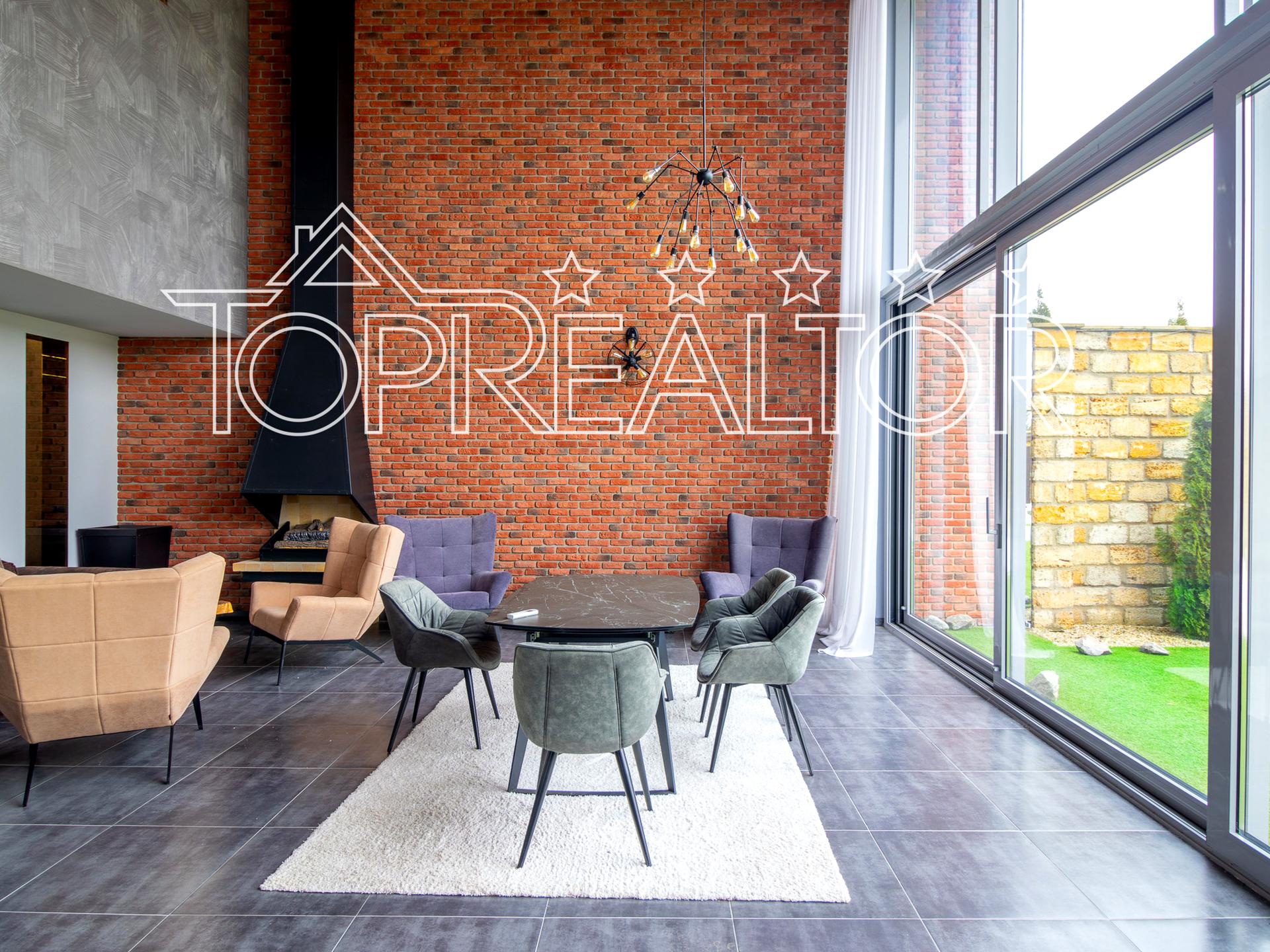 В доме сделана отделка в стиле лофт, ремонт удивляет смелыми дизайнерскими решениями, например, сделан переход барной стойки в ступеньку на лестнице, широко использованы зеркальные вставки для эффекта увеличения пространства, использованы современные текстуры в фасадах и стенах. В то же время применены высококачественные отделочные материалы, безрамочные двери, стильная электрофурнитура, электропривод штор, а центром притяжения в гостиной служит действующий камин. В доме, несмотря на небольшую площадь, расположено достаточное количество подсобных площадей и систем хранения, функциональная котельная-постирочная, смонтирован измельчитель для мусора. Площадь участка три сотки, на улице вокруг подогреваемого бассейна уложен искусственный газон, также есть подсобное помещение для инвентаря.