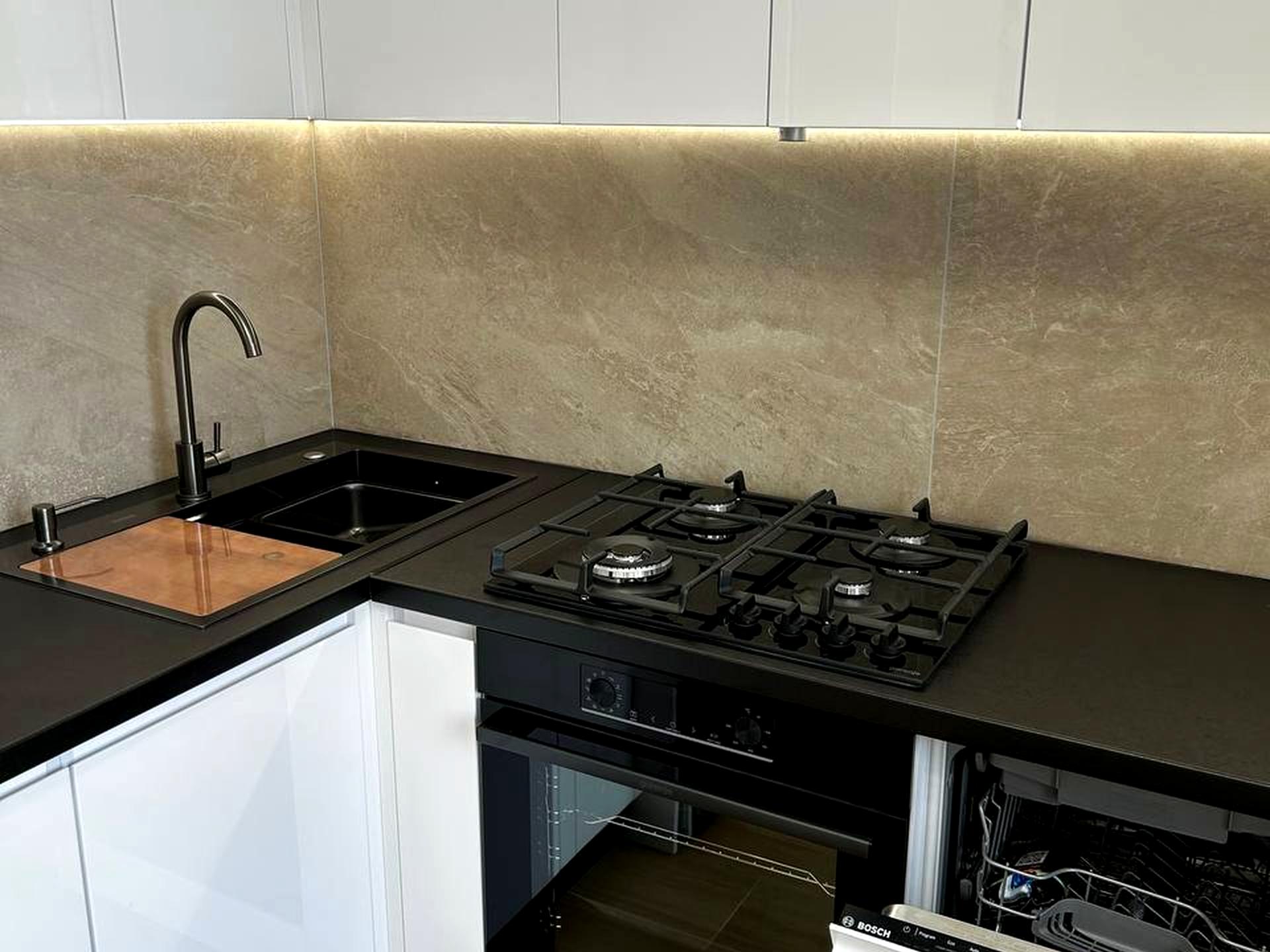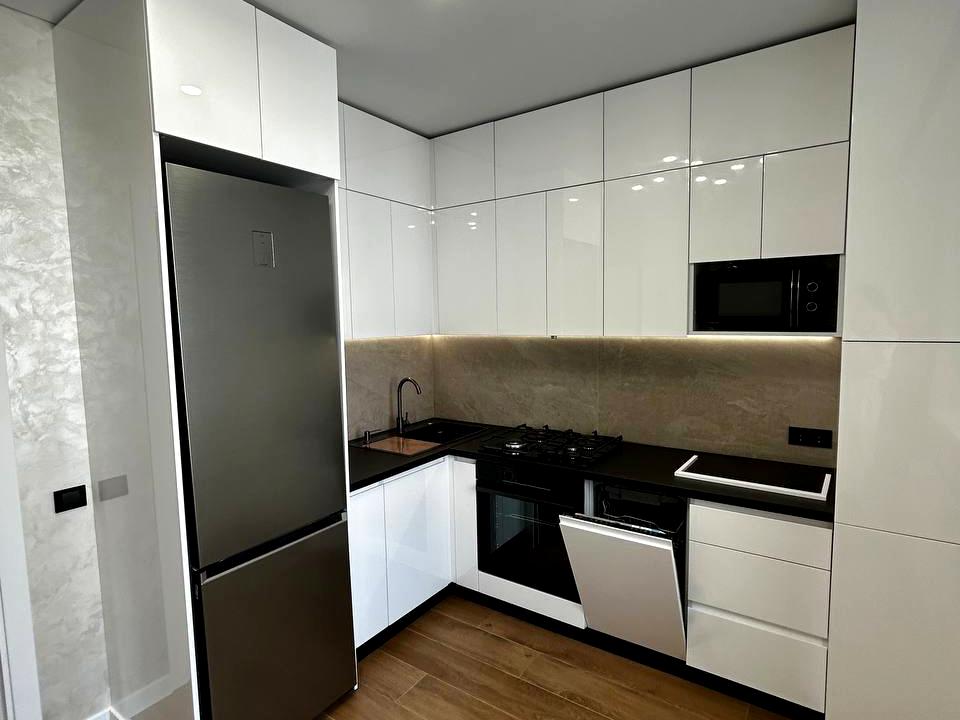 Вмонтована кухня та техніка (посудомийна машинка, варильна поверхня, духова шафа, мікрохвильовка, витяжка).