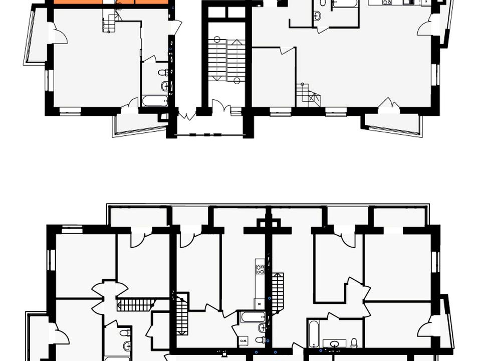 Квартира дворівнева, на першому рівні кухня та окремо кімната, можна зробити величезну кухню студію 29м.кв, на другому рівні дві окремі спальні та санвузол.