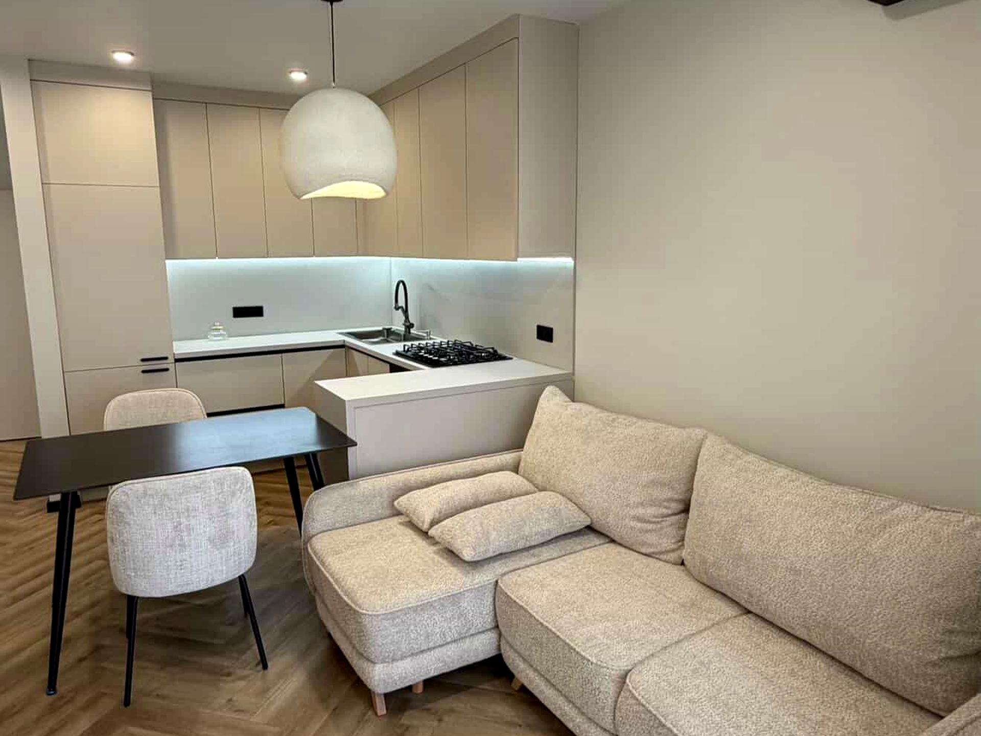 В квартире 2 комнаты, Технологія будівництва - Цегляна, Тип будинку - Спец. проект. Есть газ, кухонная плита газовая. Балкона нет. В квартире есть Телевизор, Подогрев полов, Стиральная машина, Сушильная машина, Ванна, Холодильник, Микроволновка, Посудомойная машина. Дом построен в 2024 году. Общее состояние квартиры - С ремонтом. Безбарьерность: вход в дом на уровне земли. Горячая вода - газовый котел. Количество санузлов: 1. Интернет оптоволоконный. Работает без света - вода, газ, отопление, интернет. Тип кухни - кухня-студия. Количество спален: 2. Инфраструктура территории: спортивная площадка, детская площадка. Без комиссии