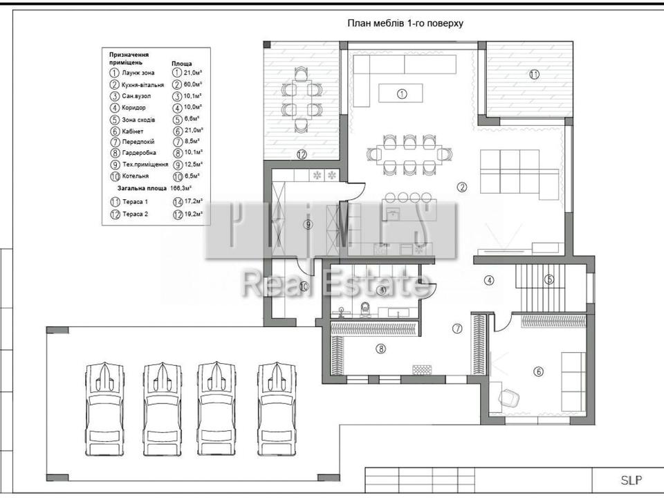 1 поверх: прихожа з вхідною гардеробною 18 м2, вітальня кухня 81 м2 з виходом на 2 тераси, сан узел, окрема кімната, котельня, пральня, кухона комора.