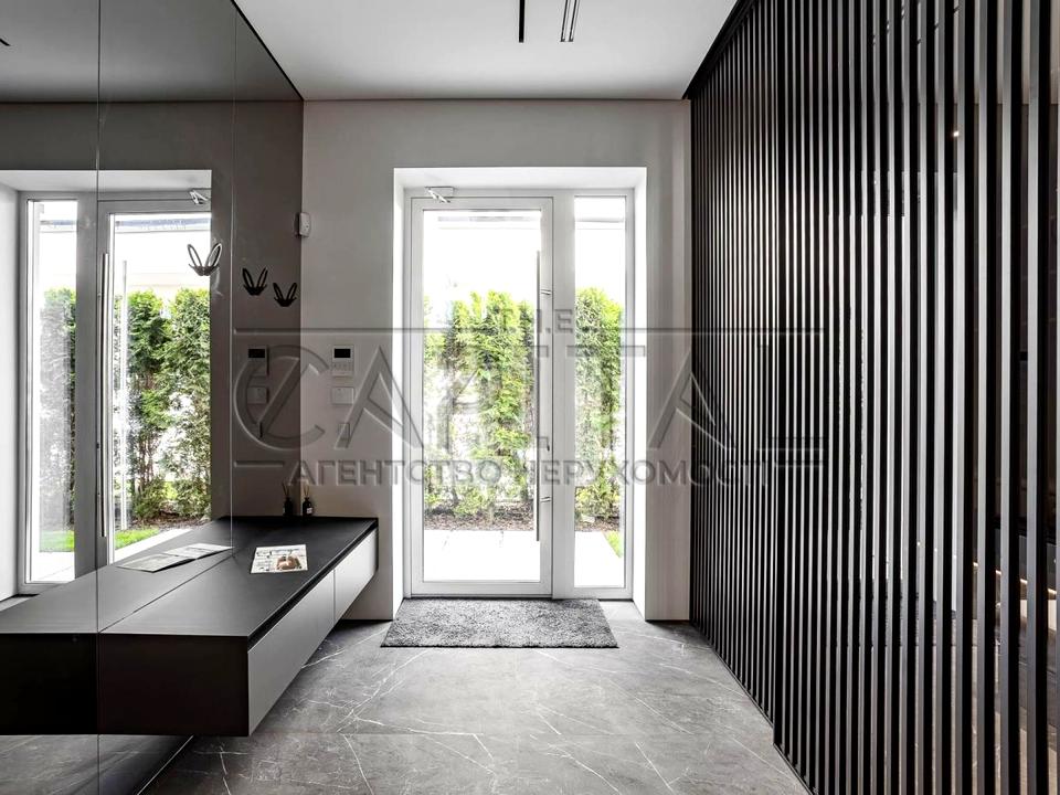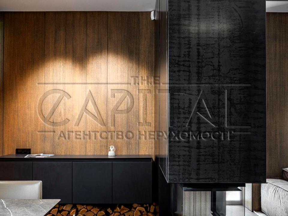 -передпокій; велика вбиральня; гостьовий с/в; вітальня з двостороннім КАМІНОМ (Італія), м'якими меблями INTERIOR, ТВ; кухня RAIT виконана з натурального шпону (дуб), робоча поверхня та барна стійка з натурального каменю, укомплектована технікою Mielle; їдальня з вітражним вікном;