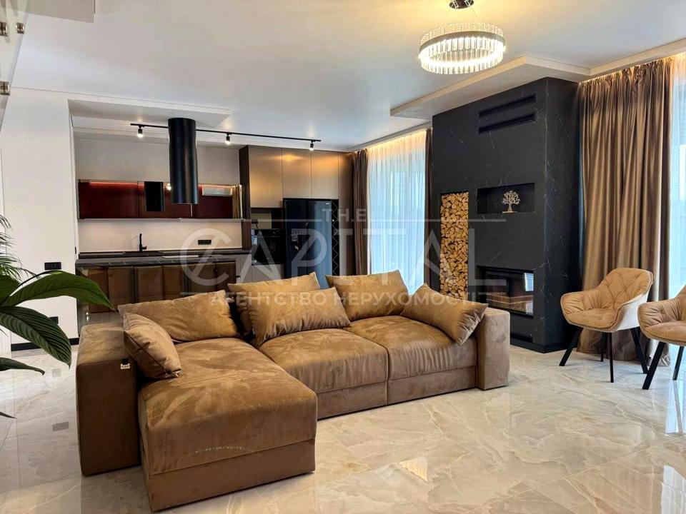 Будинок повністю укомплектований сучасними меблями (кухня з островом, диван, тумба під телевізор, 2 ліжка, гардеробна та укомплектовані санвузли) та технікою (холодильник, духова шафа, мікрохвильова піч, посудомийна машина, 3 телевізори, 5 кондиціонерів).