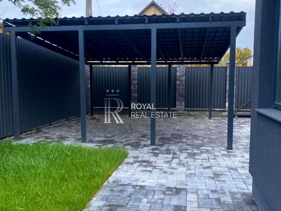 Двір з озелененням та бруківкою, металевий навіс на 2 автомобілів та парковка для 2-3 машин.