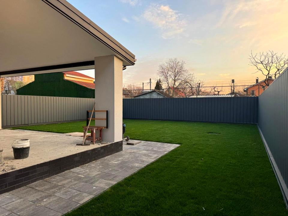 - зовнішнє оздоблення: фасад, ворота, тротуарна плитка перед будинком, газон та тераса