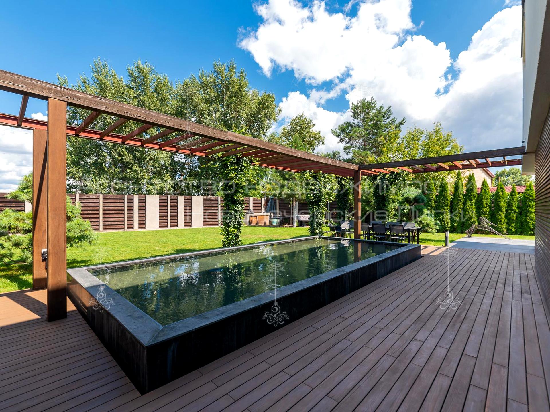 10 соток озелененої ділянки ландшафтним дизайном, затишною барбекю-зоною, відкритим басейном і терасою.