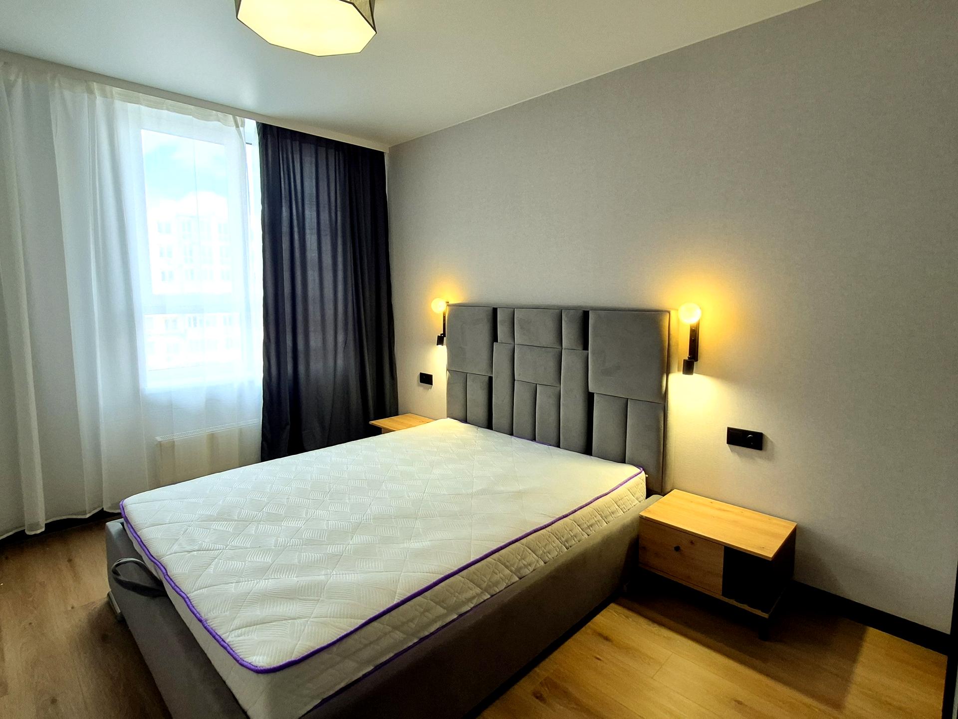 В спальні двоспальне ліжко з ортопедичним матрасом та в кухні розкладний диван.