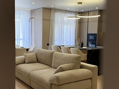 Квартира з продуманим та функціональним плануванням. Простора кухня-вітальня грамотно зонована на зону відпочинку та обідню зону. Обідній простір акцентований дизайнерською люстрою над великим кухонним столом та стільцями. Кухня повністю укомплектована всією необхідною вбудованою технікою: холодильник, посудомийна машина, варильна поверхня, витяжка, духова шафа та мікрохвильова піч. Встановлено кондиціонер. Майстер-спальня обладнана ліжком з підйомним механізмом і двома місткими шафами по обидва боки. Зі спальні є вихід на власну затишну терасу з видом алею на житлового комплексу. Санвузол з продуманими вбудованими меблями: передбачене місце для пральної та сушильної машин. Встановлені змішу...