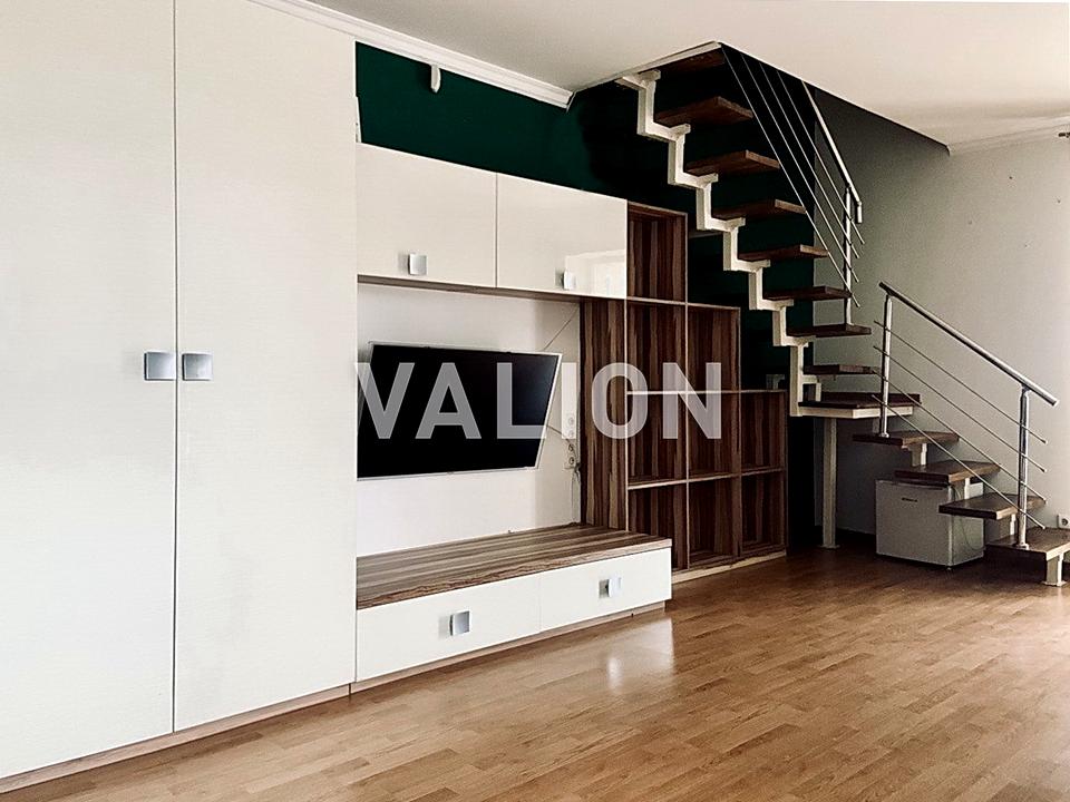 У квартирі на першому рівні кухня-вітальня, засклений балкон, санвузол 5,7 кв.м,