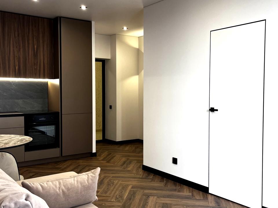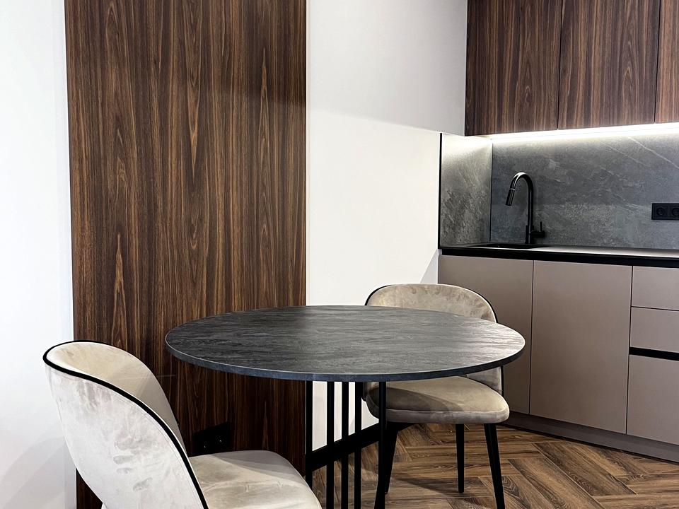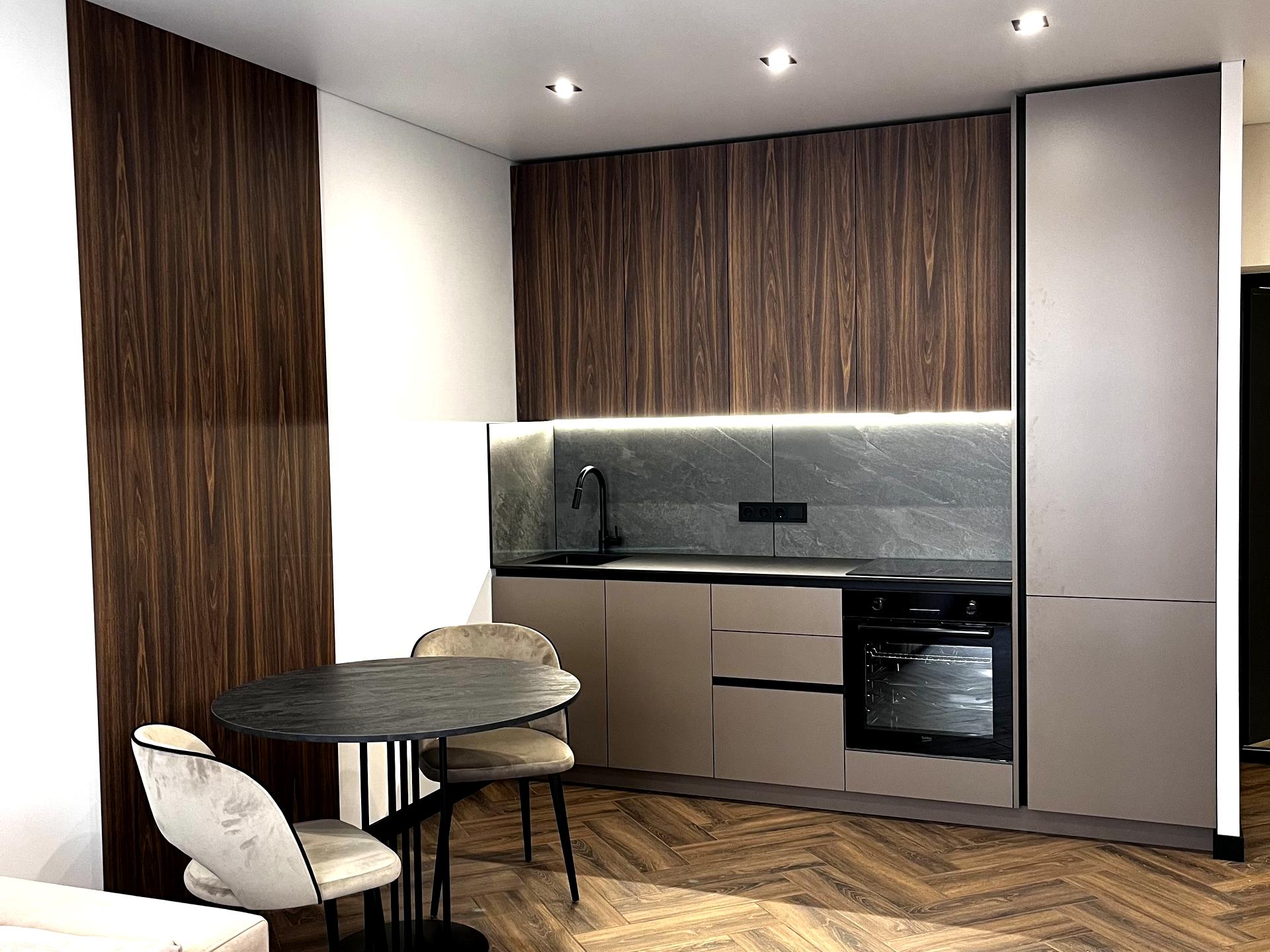На кухні вже встановлені варочна поверхня, витяжка, духова піч, холодильник. Бойлер встановлено над інсталяцією, пральну машину приховано під меблями у санвузлі. Тепла підлога на кухні, у передпокої та санвузлі. Закладні комунікації під кондиціонер у кухні-вітальні. Тепла підлога на кухні, у передпокої та санвузлі.