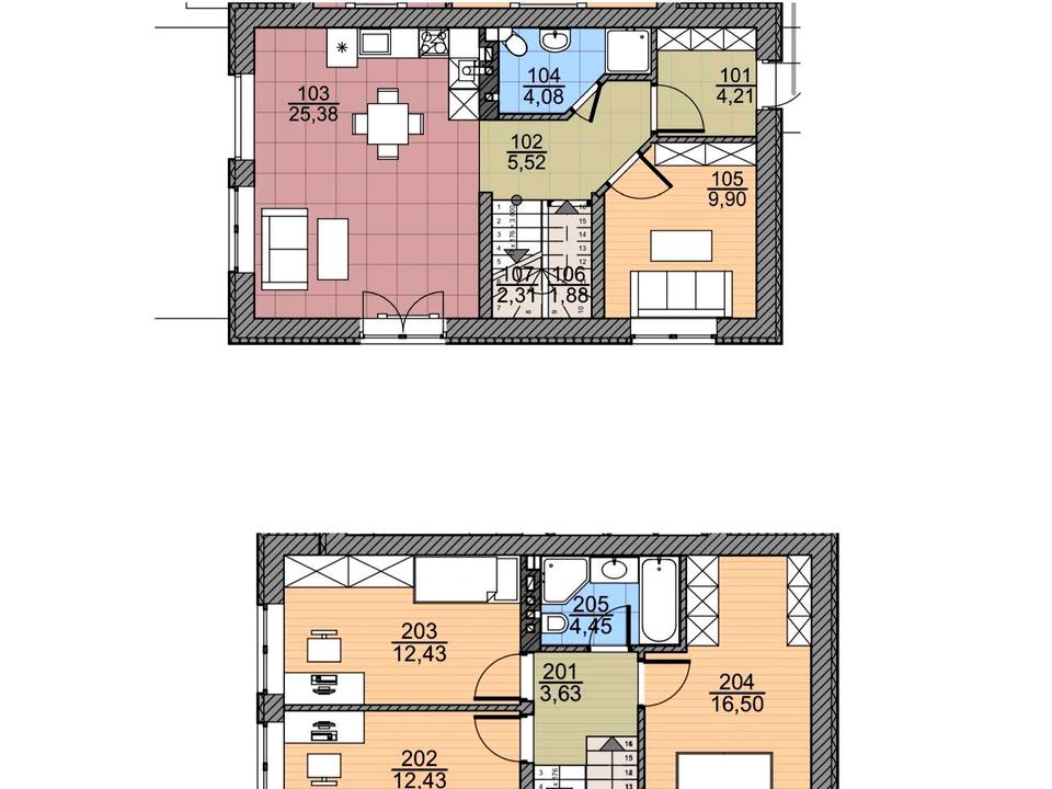 Перший поверх: коридор, санвузол, спальня, кабінет, кухня-студія.
