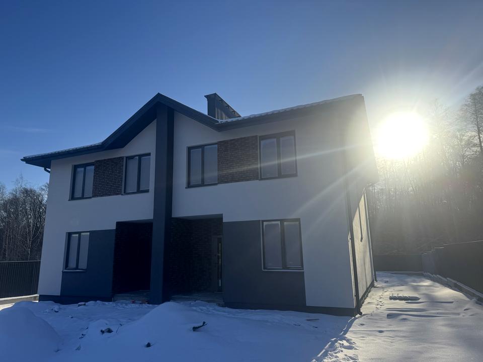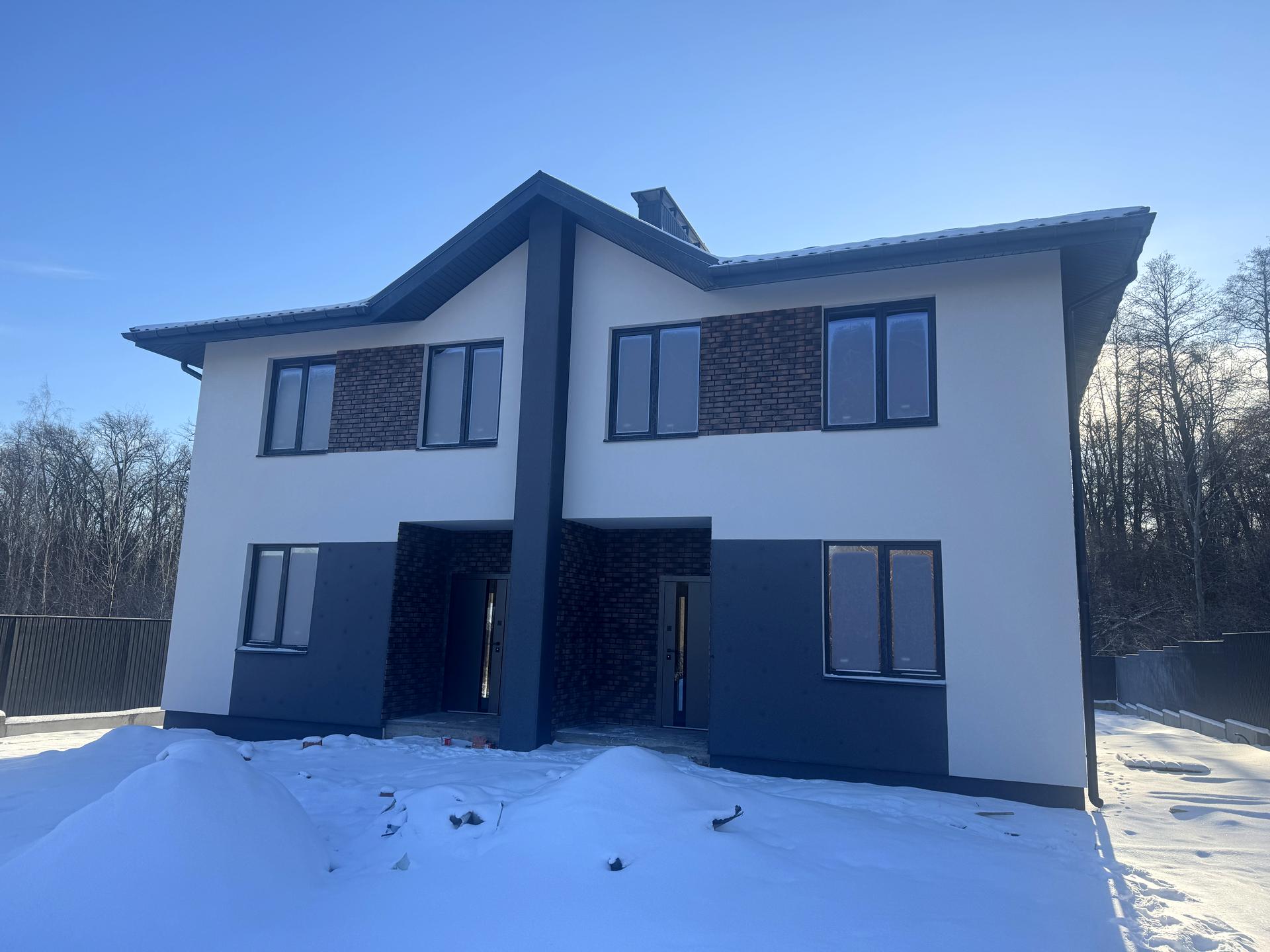 Пропонуємо дуплекс в Ірпені(Стоянка) на затишній вулиці Ранковій — сучасний будинок, зведений із якісних матеріалів і розташований у тихому приватному секторі біля лісу. Фасад виконаний у стриманій сучасній стилістиці: поєднання декоративної фасадної плитки та камінцевої штукатурки створює стильний та солідний вигляд, а великі вікна наповнюють будинок природним світлом.
