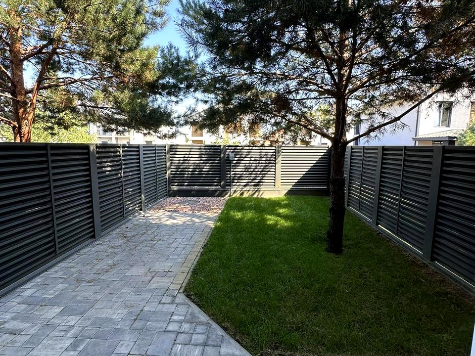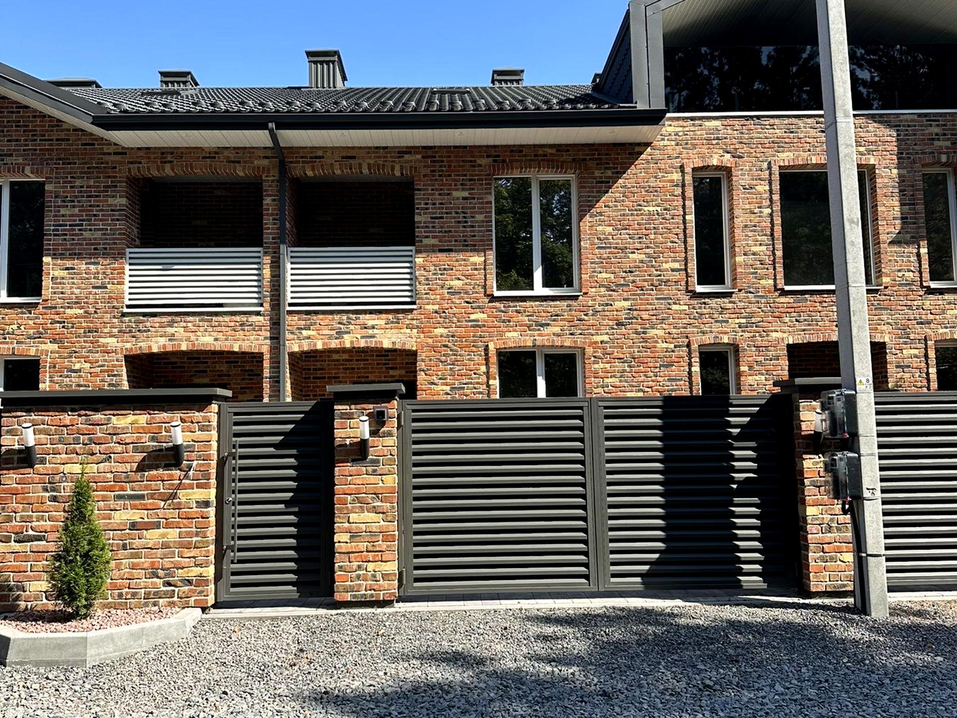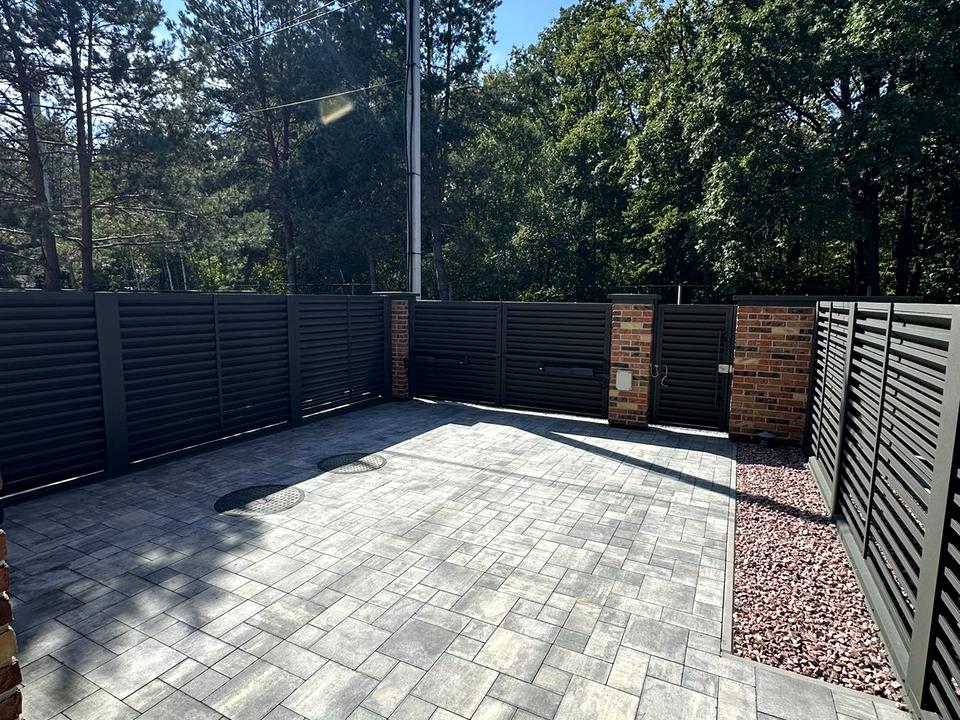 Паркан із цегляними колонами та металевими жалюзі, встановлені автоматичні ворота.
