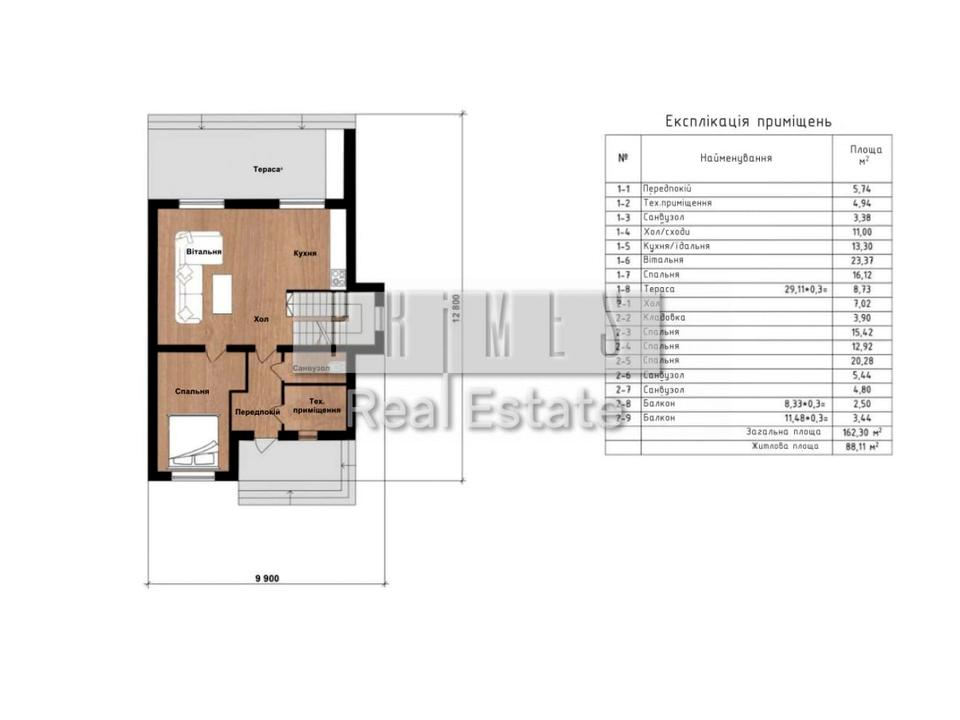 1 поверх: кухня-вітальня з виходом на терасу, простора спальня 16 м2, санвузол та технічне приміщення.