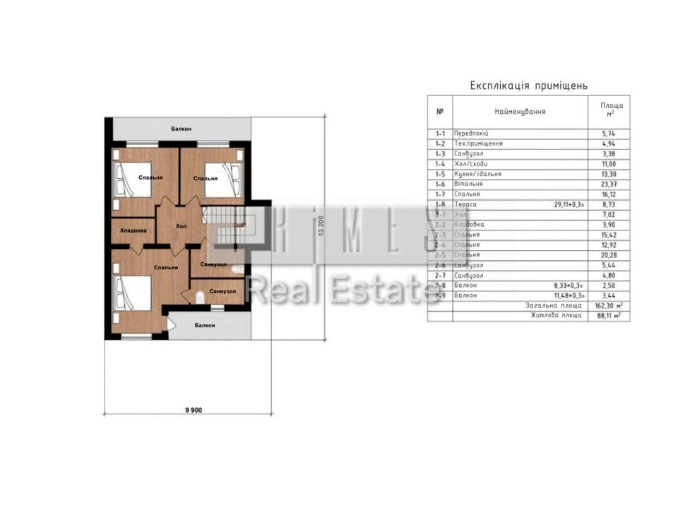 2 поверх: три спальні з виходами на балкон, два санвузли, комора та великий хол.
