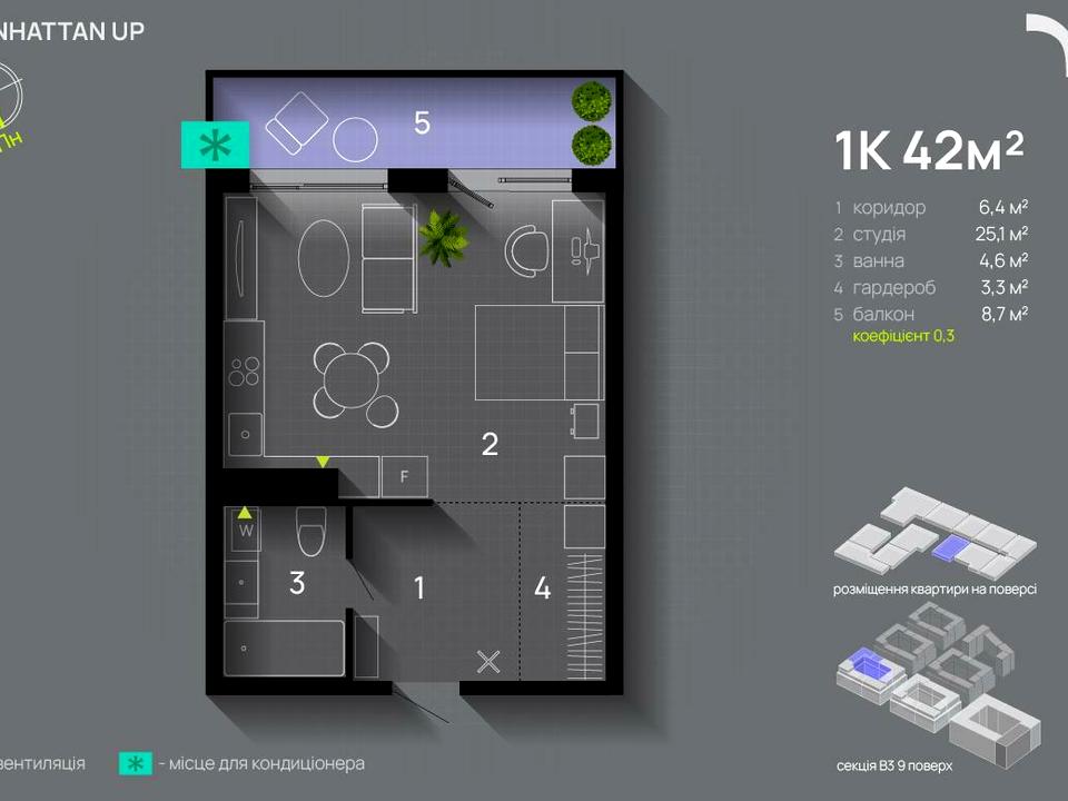 Каскадне будівництво, 6 великих кварталів із зеленими облаштованими дворами, повноцінна інфраструктура, підземний паркінг, сучасні технологічні рішення є ключовими складовими концепції Manhattan UP. На території району передбачені дитячий садок і школа.