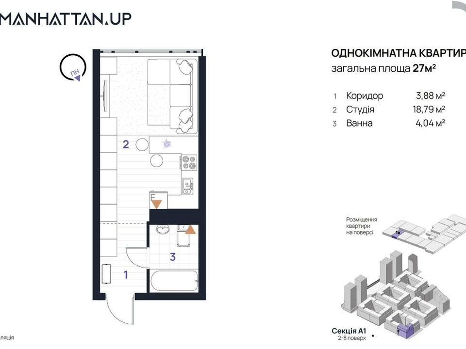 Квартира загальною площею 27 м2 з функціональним продуманим плануванням: