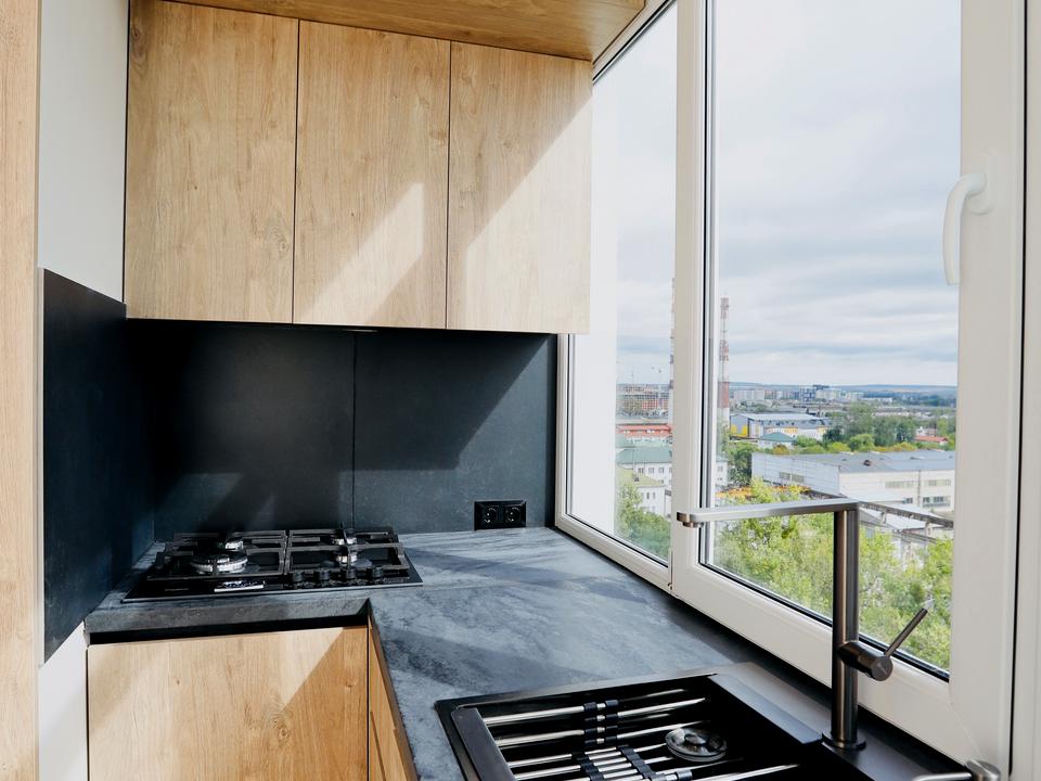 • кухонна зона обладнана меблями та новою технікою останнього покоління: газова варильна поверхня, духова шафа, холодильник та посудомийка