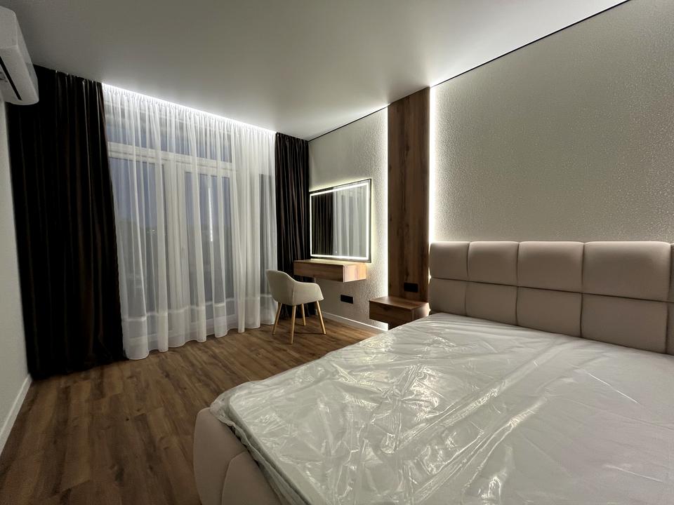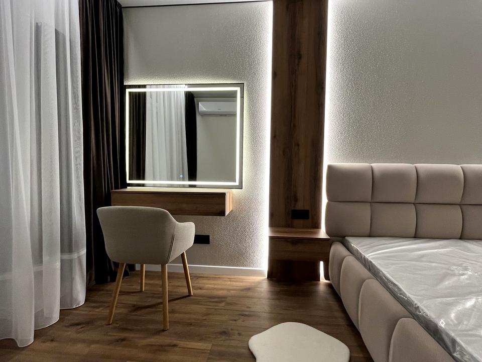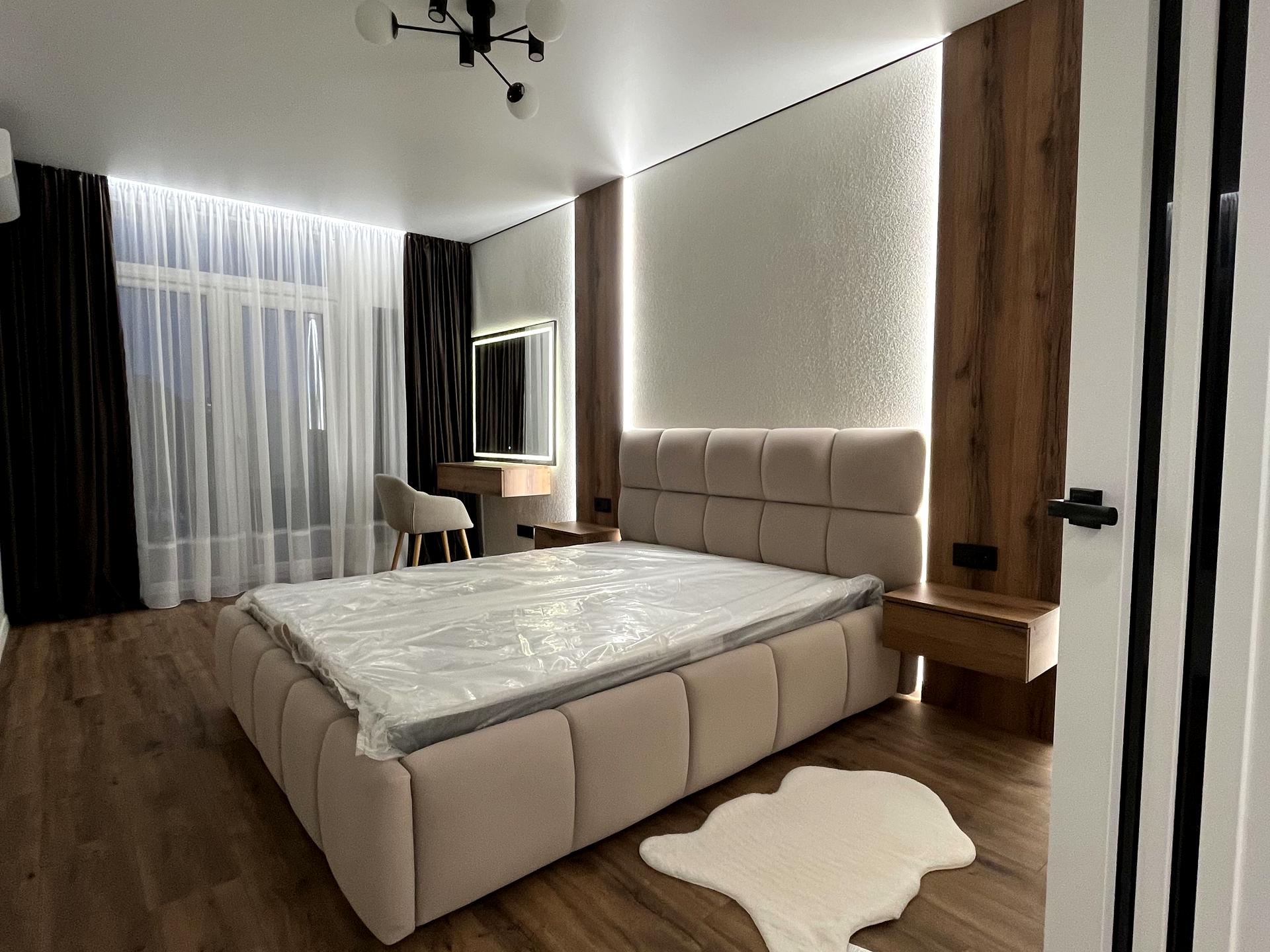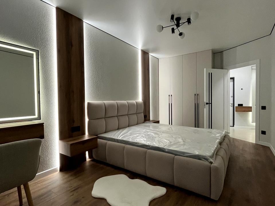 Простора спальня з різними сценаріями освітлення — від м’якого вечірнього до яскравого денного — створює атмосферу затишку та комфорту.