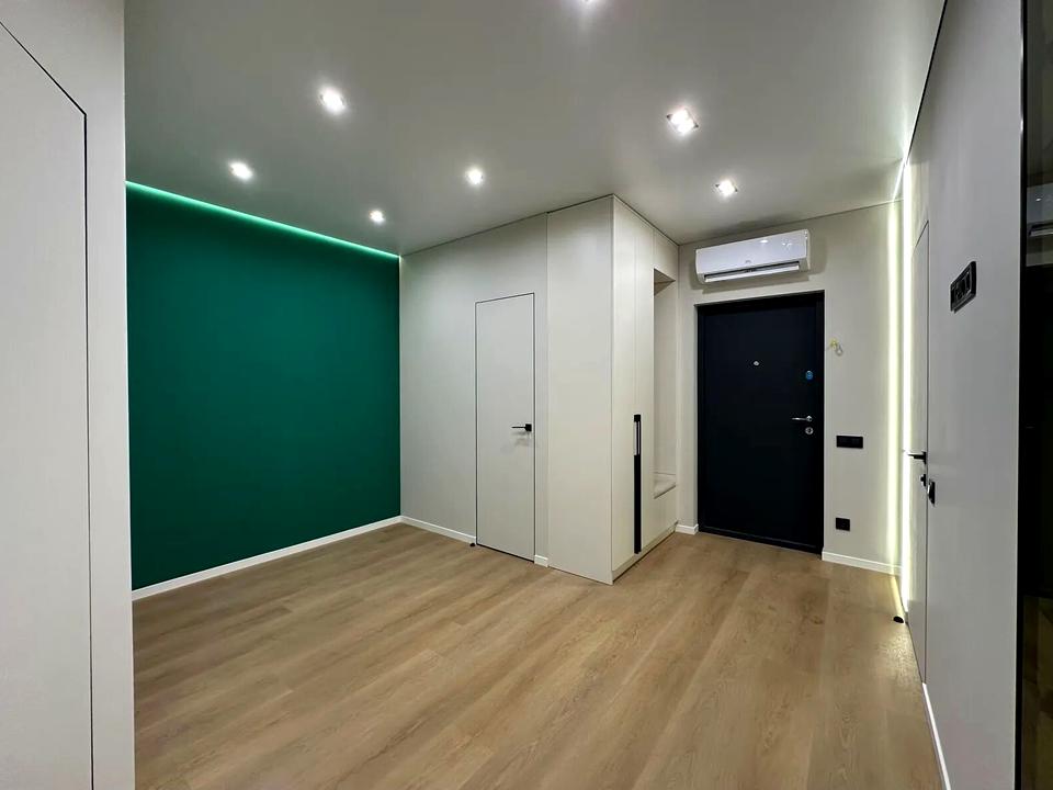 Підвісна стеля з тіньовим профілем, вмонтовані карнізи з підсвіткою, двері прихованого монтажу.