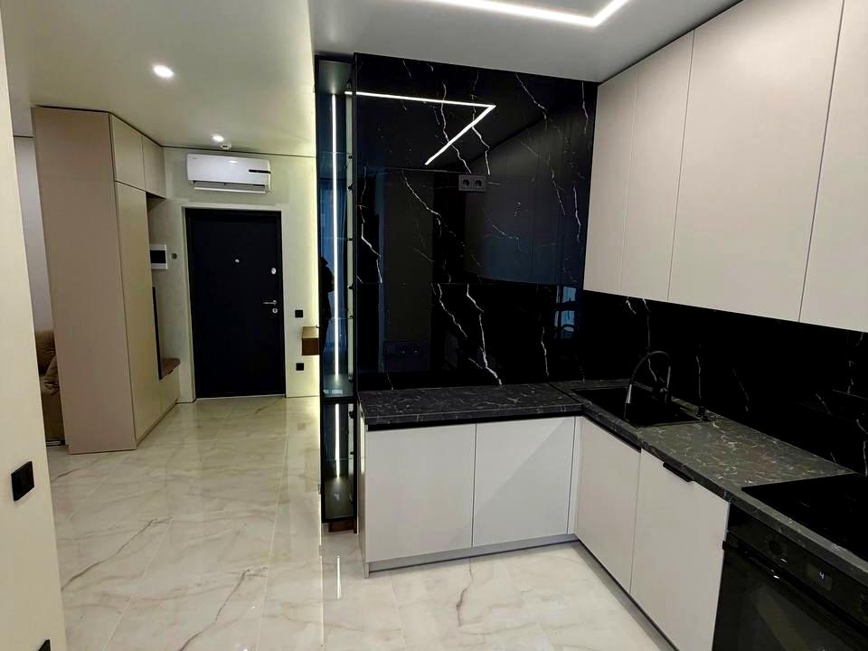 В квартире 1 комната, высота потолков 2.7 метра, Технологія будівництва - Блочна, Тип будинку - Спец. проект. Газа нет, кухонная плита электрическая. Есть балкон. В квартире есть Подогрев полов, Кондиционер, Стиральная машина, Ванна, Холодильник, Микроволновка, Посудомойная машина. Дом построен в 2024 году. Общее состояние квартиры - С ремонтом. Горячая вода - электрический бойлер. Количество санузлов: 1. Интернет беспроводной. Работает без света - интернет, лифт. Тип кухни - кухня-студия. Количество спален: 1. Без комиссии