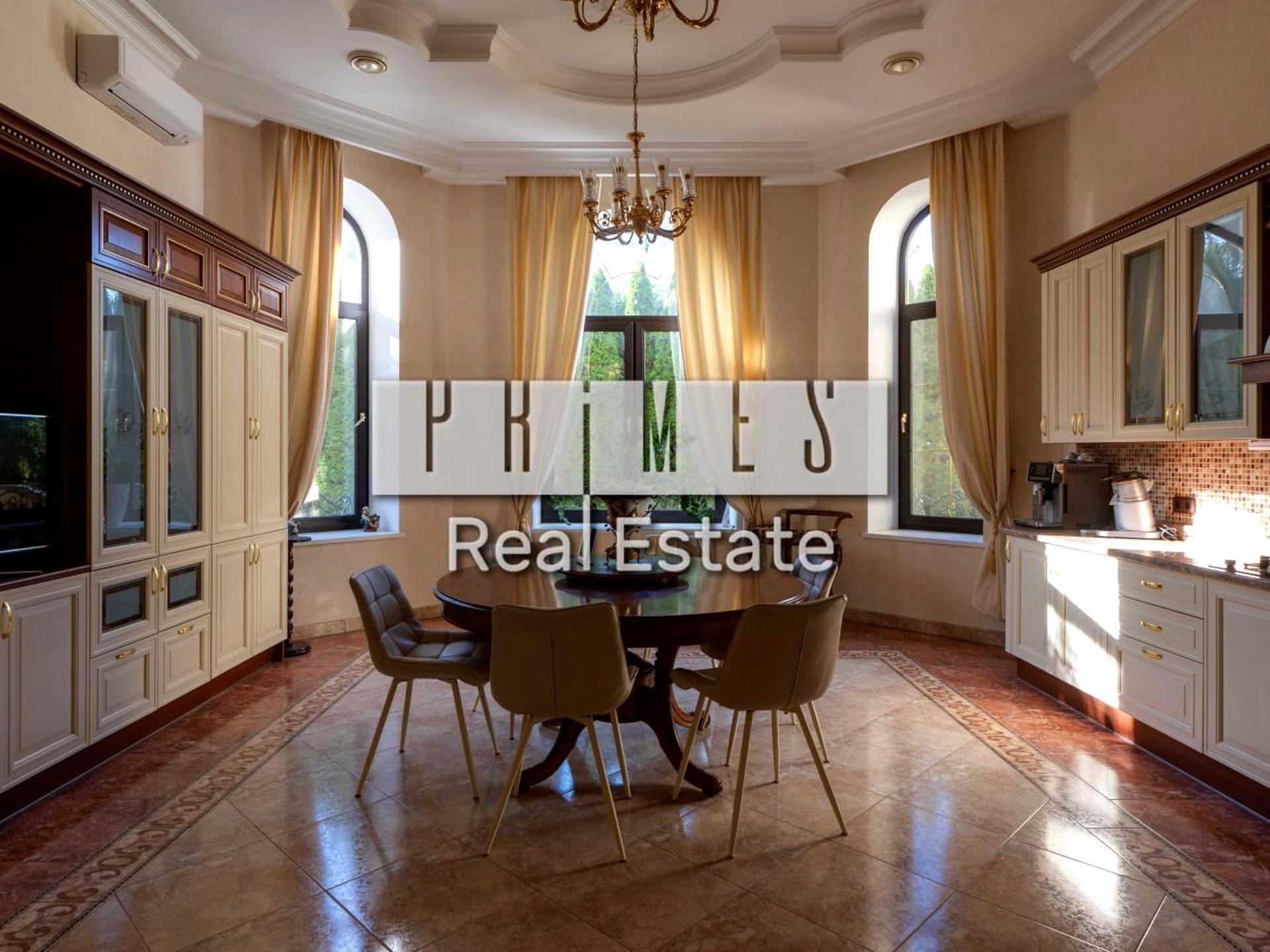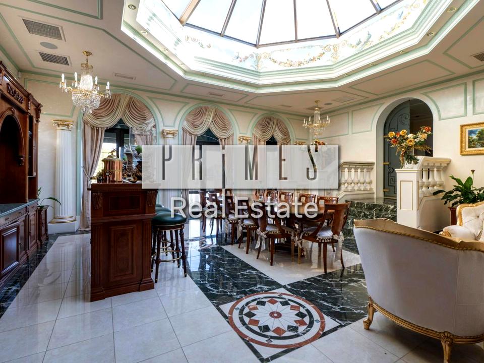 Укомплектований усіма необхідними меблями та технікою: велика вітальня зі столовою зоною, кухня, чотири окремі спальні, чотири санвузли, зимовий сад, спа зона, великий закритий басейн, великий кабінет, кінотеатр, кімната для охорони, пральня, технічна кімната, великий гараж, велика веранда. Окремо літня зона з террасою та причалом, вихід до води.