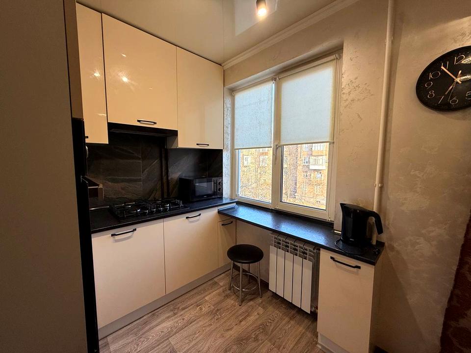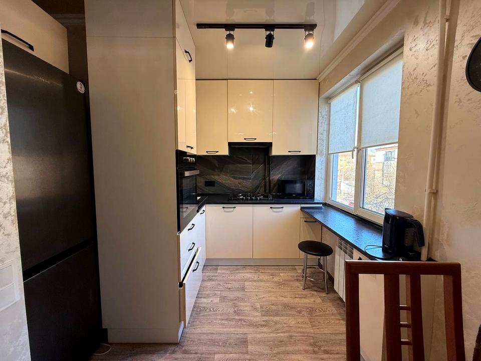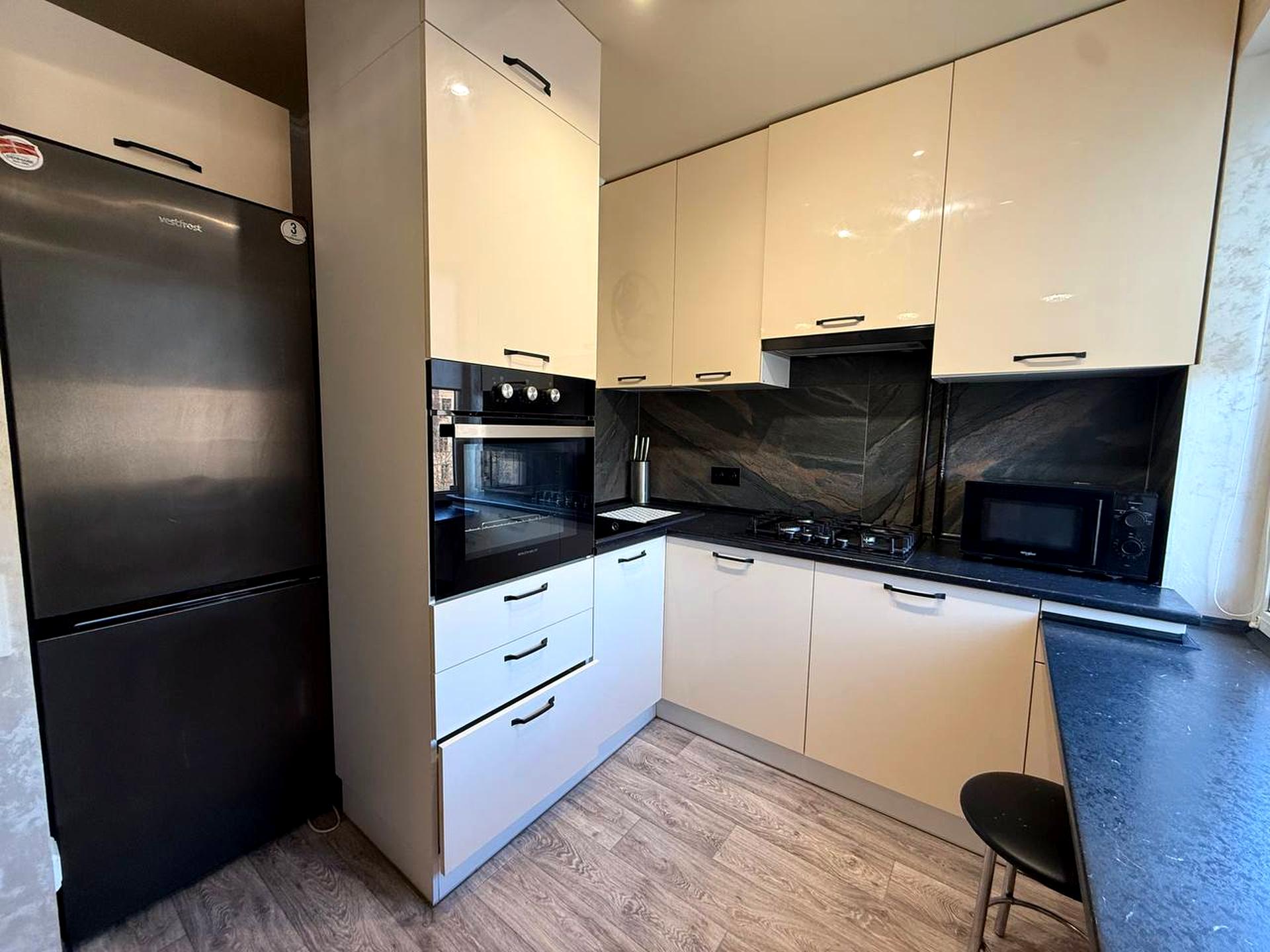 Квартира з євро ремонтом, укомплектована всіма меблями та технікою: газ. колонка, холодильник, ел.чайник, газова варильна панель, ел. духовка, витяжка, мікрохвильова піч, пральна машина, ел. сушарка для рушників, 2 телевізори, кондиціонер.