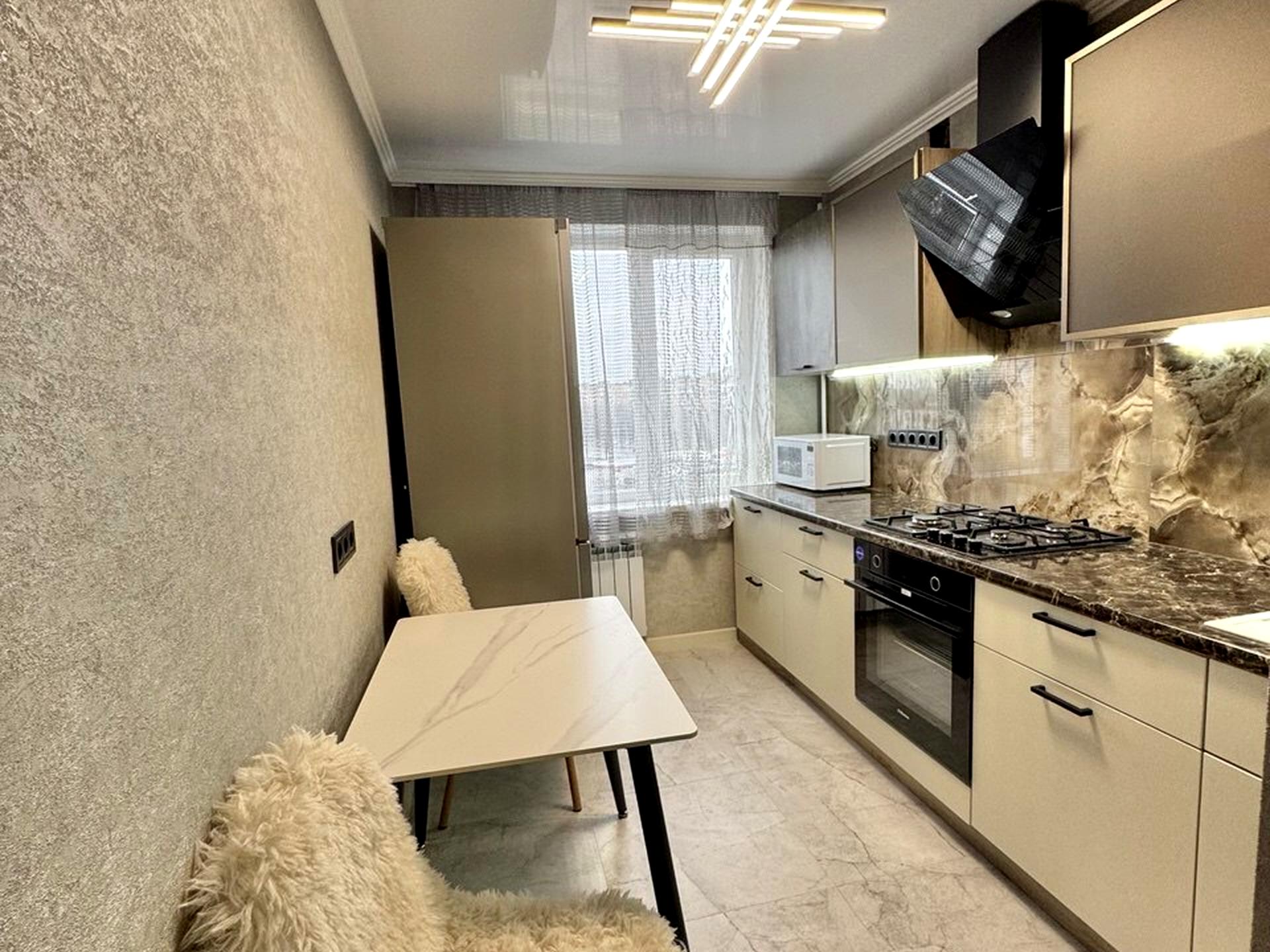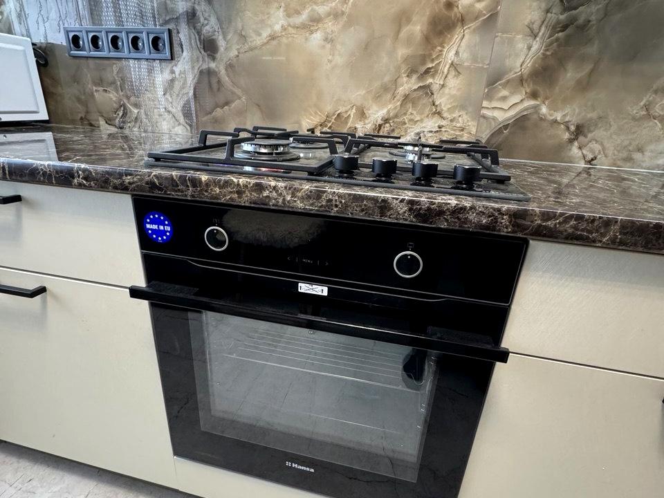 + кухня укомплектована вбудованими меблями, є підсвітка робочої зони, нова варильна поверхня, духова шафа, витяжка та холодильник, меблі для обідньої зони