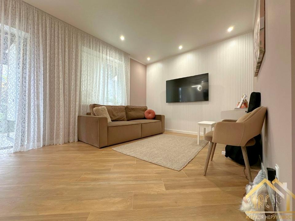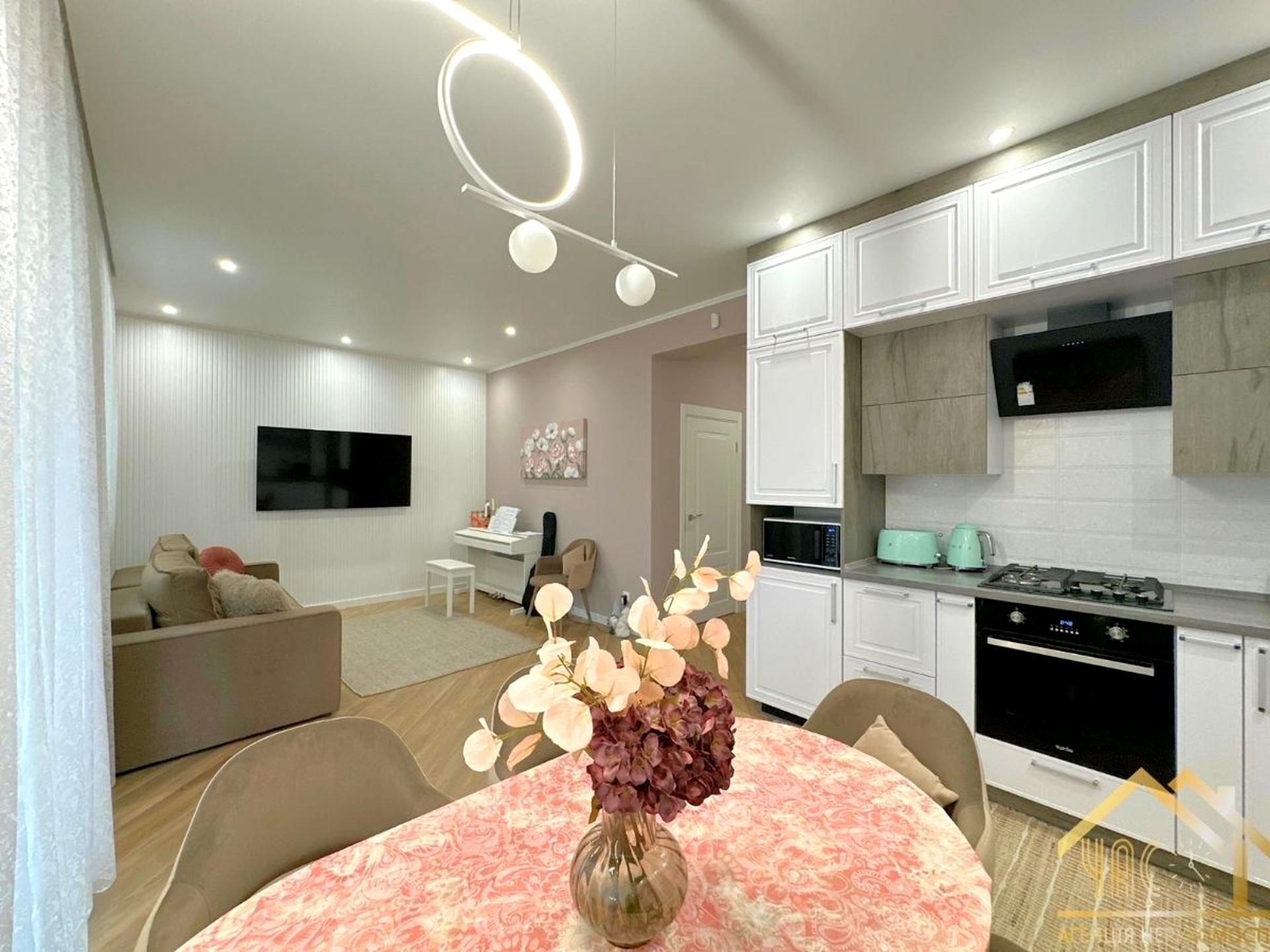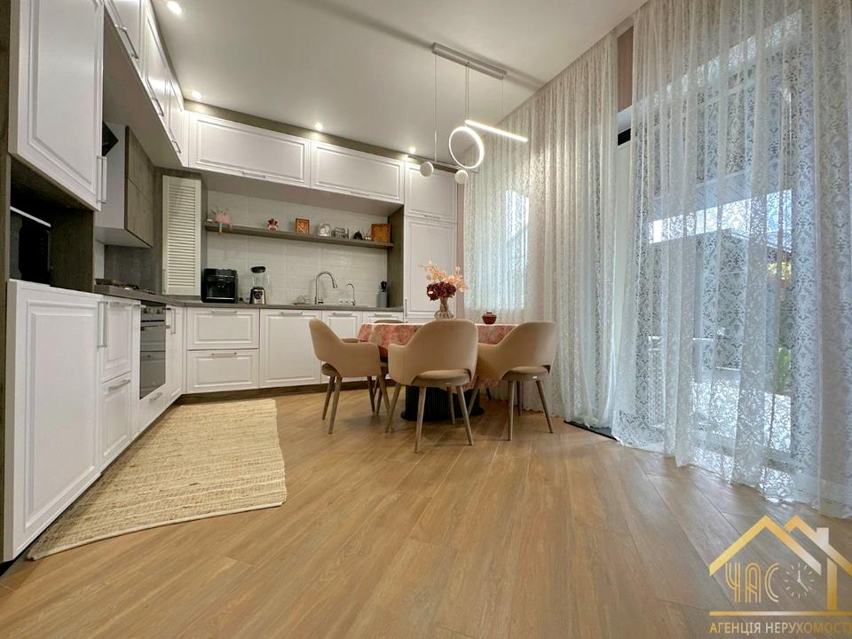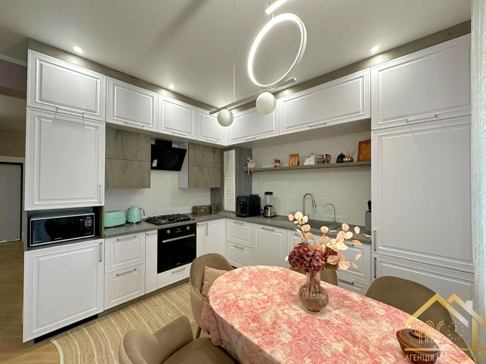 Кухня: меблі, повний комплект побутової техніки (газова плита, посудомийна машина, духова шафа, мікрохвильова, холодильник, фільтр води), телевізор, кондиціонер, обідній стіл зі стільцями, диван.