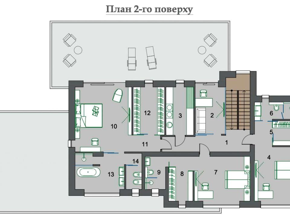 2 поверх: 3 спальні з персональними гардеробними та санвузлами, пральня кімната та кабінет