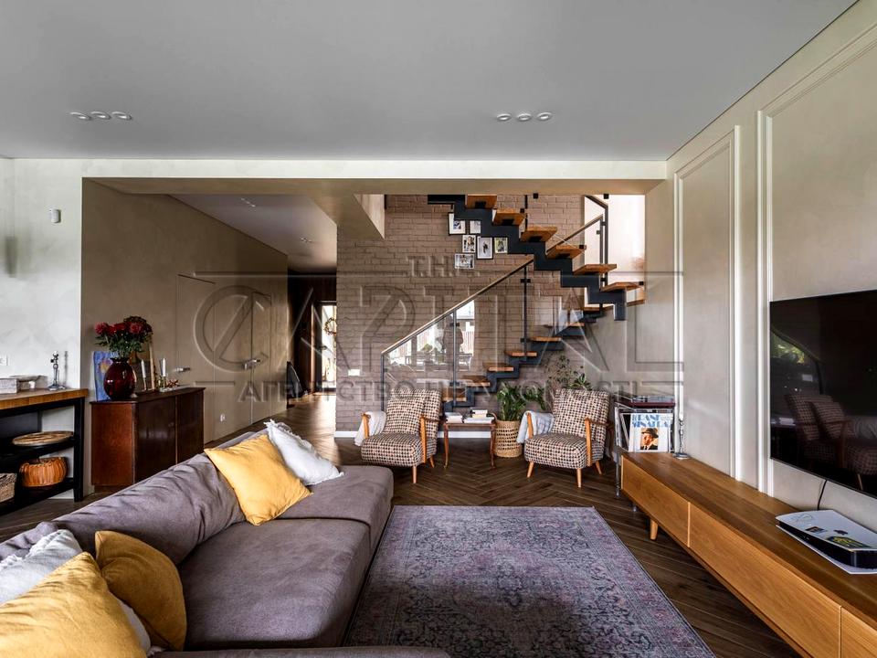 Будинок виконаний у сучасному стилі «Брутал», а інтер’єр — у витонченому стилі Неокласика, що поєднує комфорт, функціональність і дизайн.