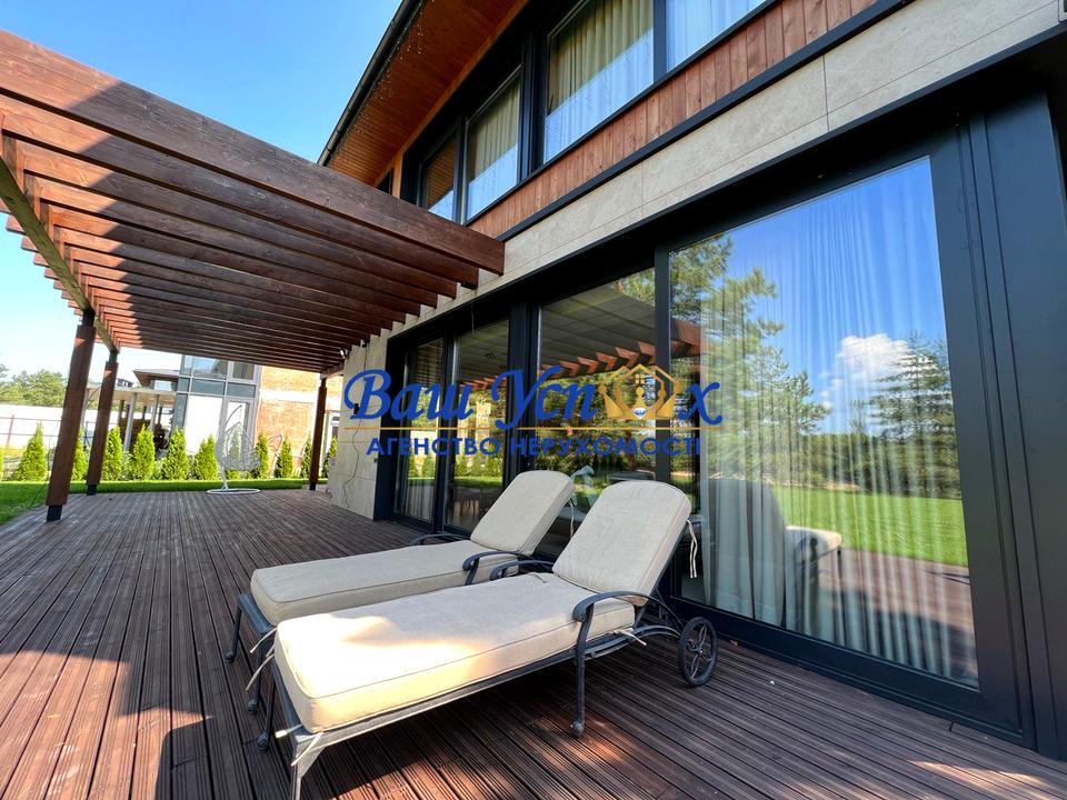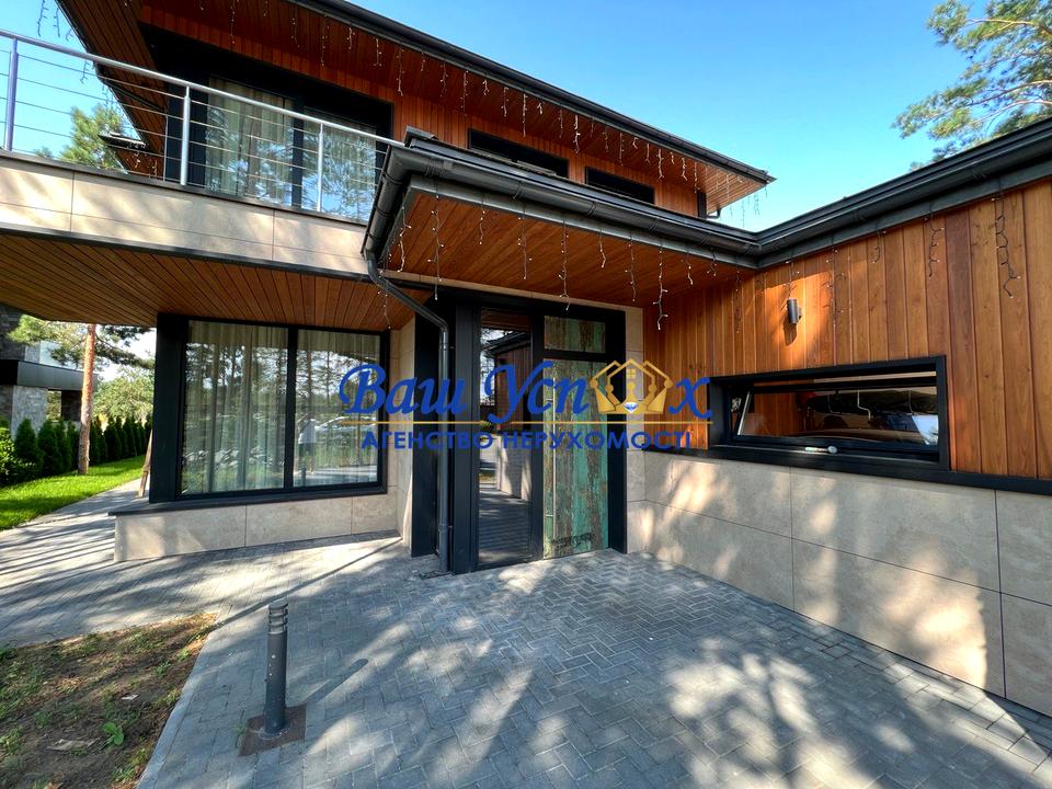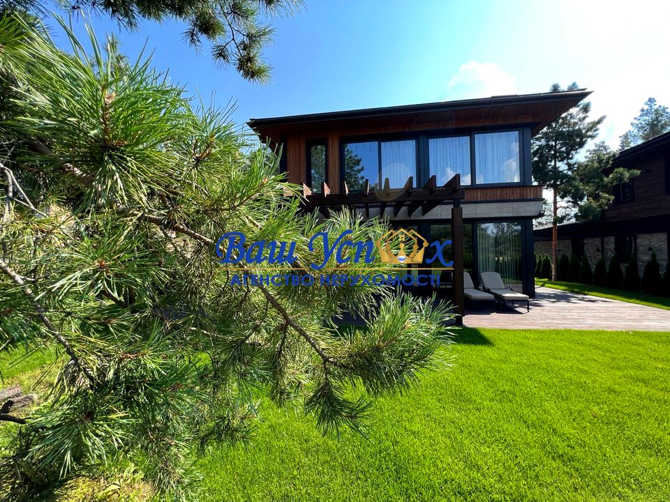 Продається сучасний БУДИНОК у лісі площею 280 м² в стилі hi-tech в котеджному містечку “Riviera Village”. Котеджне містечко знаходиться у с. Лебедівка і включає в себе вихід на Київське море, ліс, річку, зони для релаксу, спортивні локації, сервіси 24/7.