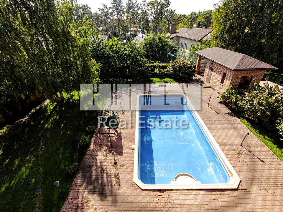 На просторій ділянці 12.6 соток розміщено основний будиноак 495 м2 з житловим цоколем, басейн 12х6 м з італійського рідкого каміння, вольєр для собаки та будинок для інвентарю та генератора.